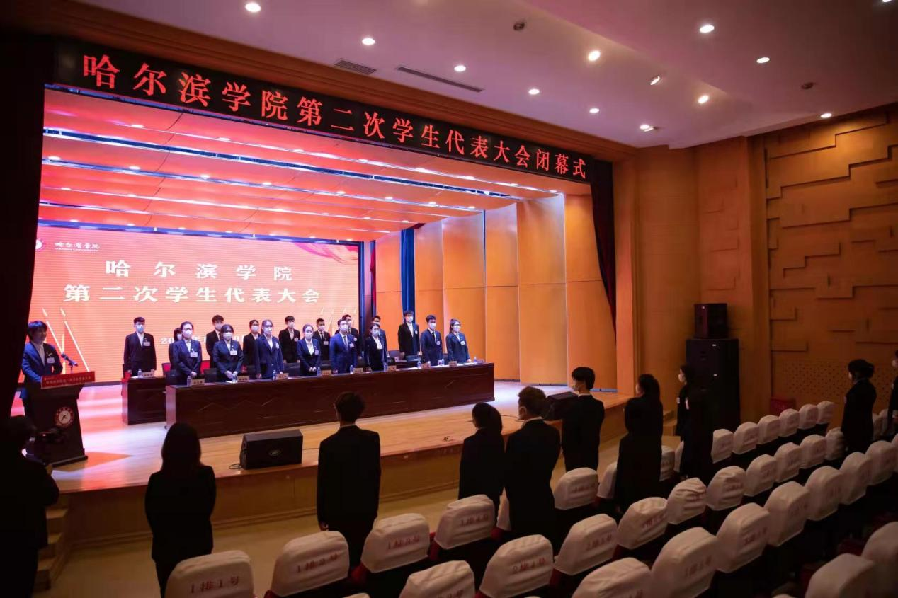 下午13时,大会闭幕式在音乐与舞蹈学院小音乐厅举行,会议审议通过了《哈尔滨学院第一届学生会委员会工作报告》、《哈尔滨学院学生会章程》等各项决议,选举产生哈尔滨学院第二届学生会委员会委员、主席团成员、学生兼职副书记。校学生会执行主席王宇剑代表学生会委员会向全校同学发出倡议,倡议同学们要牢记初心使命,以咬定青山不放松的执着奋力实现既定目标,以行百里者半九十的清醒不懈推进中华民族伟大复兴,让我们在实现中国梦的伟大实践中贡献我们磅礴的青春能量。大会在《哈尔滨学院校歌》的激昂声和“青春磨砺出彩,挑战成就未来”的响亮口号中圆满落幕。