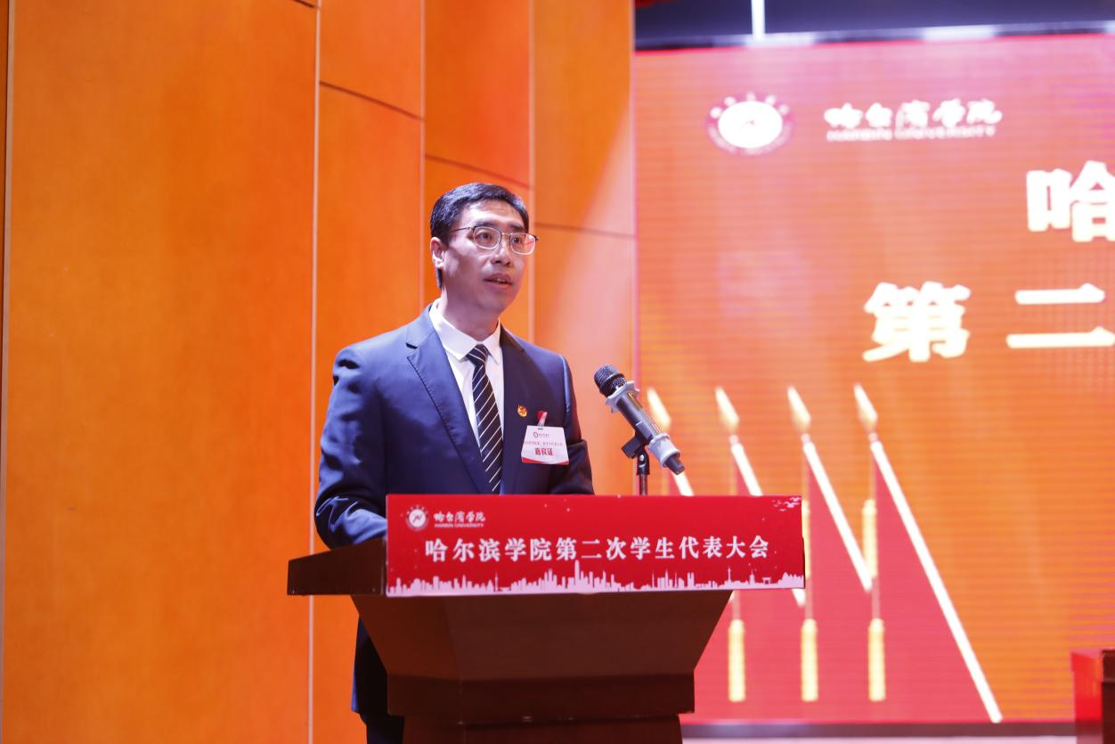 开幕式上,学校党委委员、副校长吴旭峰代表学校党委,对大会的召开表示热烈的祝贺,并向一直关心学生发展、关爱学生成长的各职能部门以及长期以来指导和支持学校学生工作的上级团组织、学联组织表示衷心的感谢。他指出,学生会以习近平新时代中国特色社会主义思想为指导,认真贯彻落实学校党委和上级学联要求,在校团委的指导下,团结带领广大同学积极进取、勇于担当,在服务学校发展、服务同学日常学习生活中发挥了重要作用,成绩值得充分肯定。同时,他向全校青年学生提出三点希望,一要牢记使命担当,做知校爱校的新时代学子;二要筑牢“三个阵地”,唱响新时代青年向上向善主旋律;三要认真履行职责,做起而行之的服务者。最后他希望各位代表和新一届学生会委员会全体成员,一定要牢记神圣使命,履行庄严承诺,继承和发扬我校学生会组织的优良传统,在新的起点上肩负使命、担当有为,继续团结同学、服务同学、联系同学,在矢志奋斗中谱写新时代的青春之歌,为高质量建设国内知名、省内一流、特色鲜明的高水平应用型哈尔滨大学而努力奋斗,以优异成绩迎接学校第二次党代会的召开。