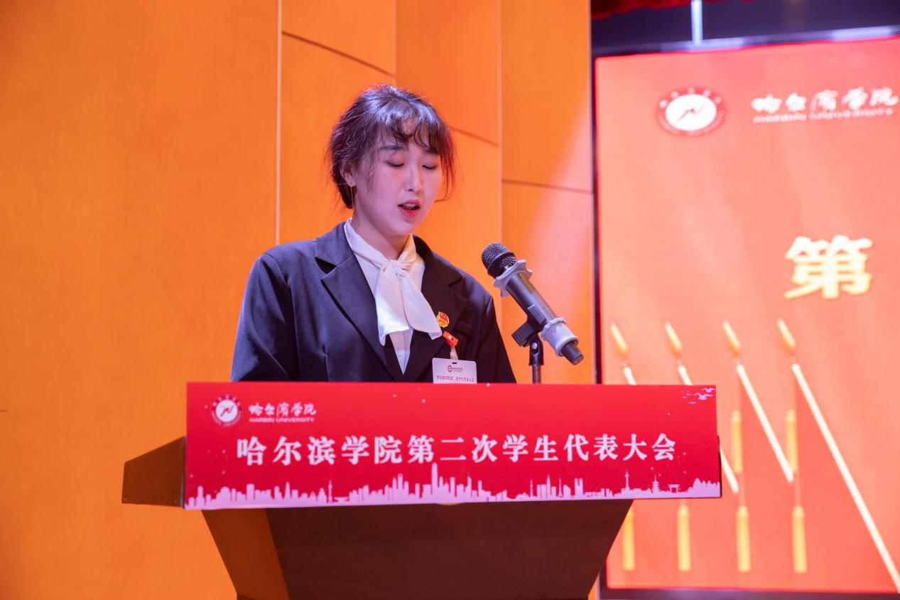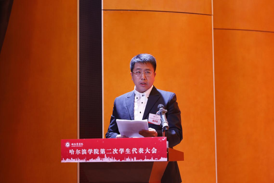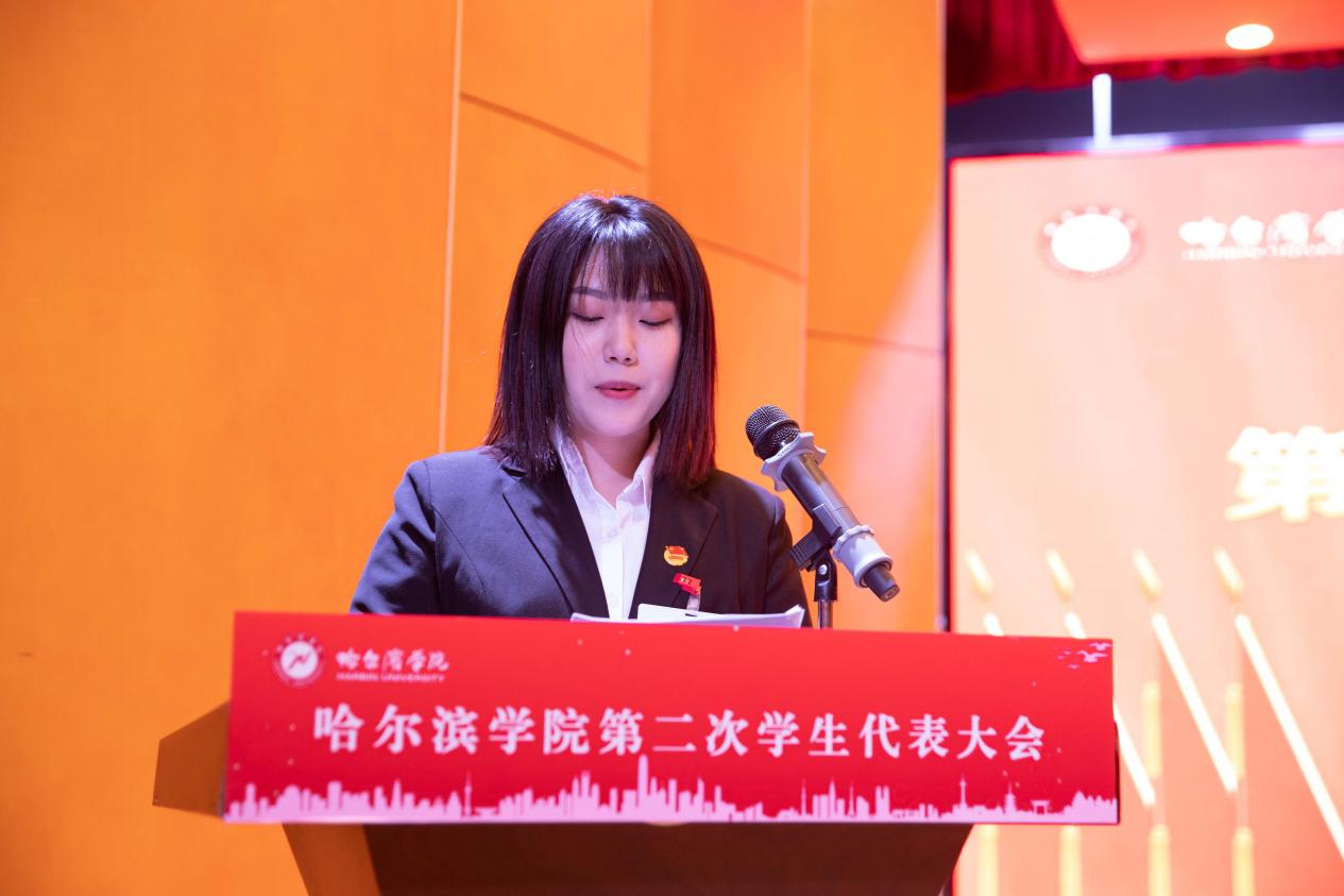 上届校学生会主席郭胜男同学致开幕辞。她表示,本次大会不仅是对过往工作的回顾和对未来工作的展望,更是推动建设我校学生会深化改革的重要契机。希望广大同学在未来的发展中,始终坚定理想信念。信念永远是激励我们奋进向前、克难制胜不竭的力量源泉。我们要时刻秉承“崇德砺志 博学笃行”的哈院精神,勇做新时代的坚定者、奋进者、搏击者。