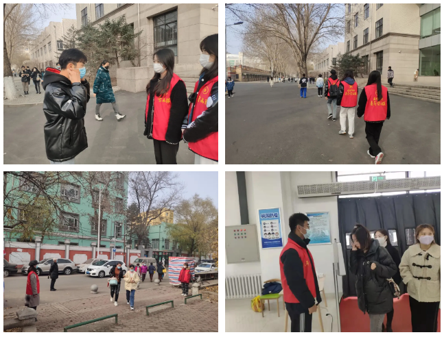 11月3日、4日中午,文法学院青年突击队分别在西沟街、食堂门口、图书馆门口、校园人行道站岗、巡逻,引导学生保持健康距离,劝导学生正确佩戴口。