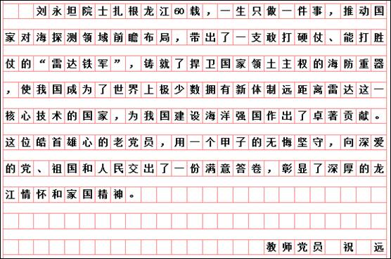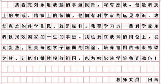 按照市委学组办《关于线上收看“时代楷模”刘永坦先进事迹报告会的通知》和学校党委宣传部、组织部要求,艺术与设计学院党委组织全体党员于10月29日19时,通过“极光新闻”客户端直播收看报告会,师生反响热烈。各支部书记又组织教师党员结合工作实际书写观后感言,深入开展艺术与设计学院“迎接校第二次党代会召开,亮身份、领任务、做表率”活动。教师党员韩东晨、冀德玉、王志海、王惠、郭杨、杨扬、高阳、高亮、孙世为、王霞、郭鹏程、祝远、田闯、路遥、学生党员王敬然、学生干部杨洁和聂智美等认真撰稿,向楷模学习,为哈尔滨学院的快速发展助力,为艺术与设计学院的美誉度而努力工作!