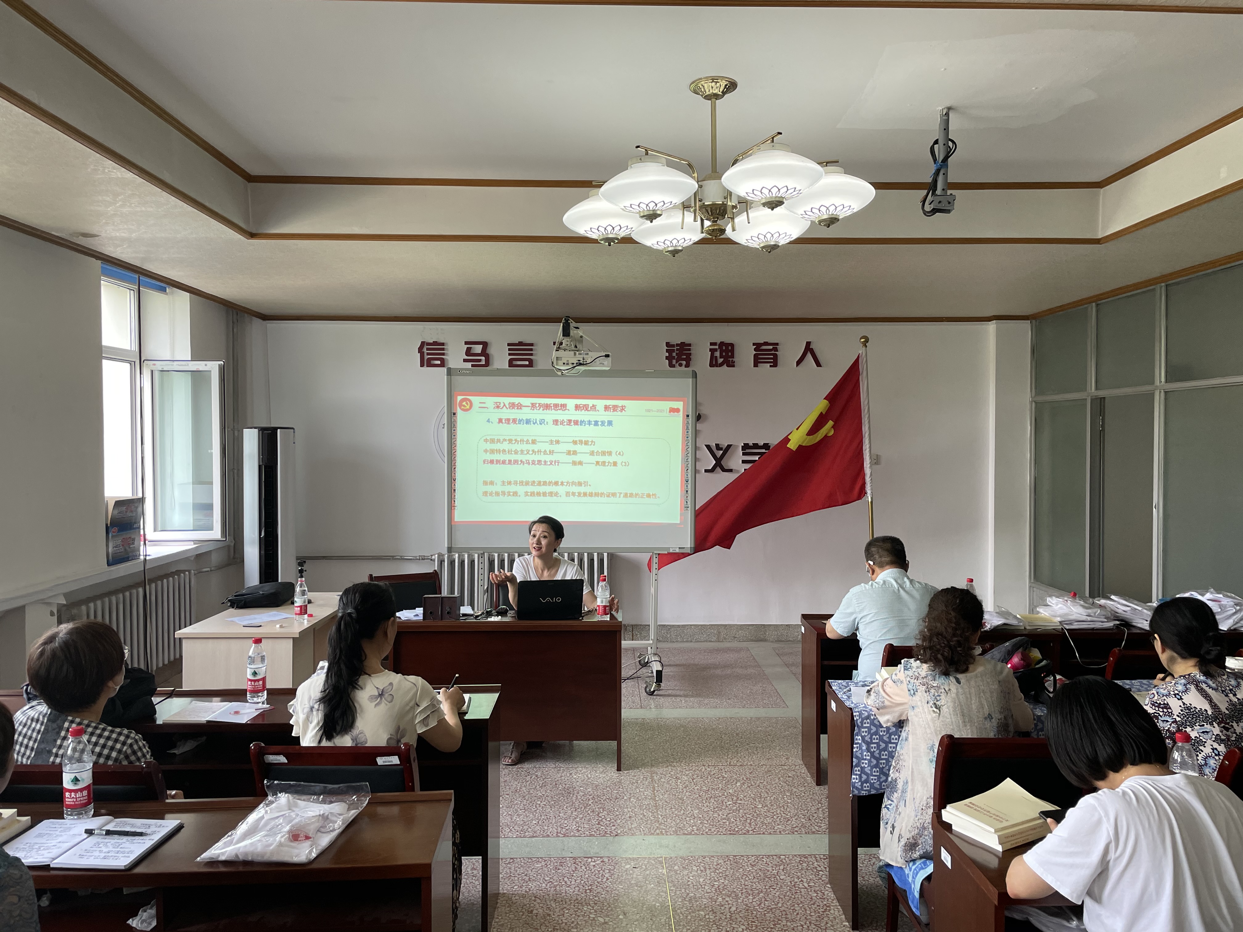 马克思主义学院党总支书记孙芳,以“继往开来的新时代政治宣言--学习习近平总书记‘七一’重要讲话精神”为题,从“七一”重要讲话精神的伟大意义——向第二个百年目标进军的政治宣言和行动纲领、理论创新——深入领会一系列新思想、新观点、新要求、学习贯彻——落实政治建校,坚持以史育人等三个方面,全面深入的对讲话精神进行阐释解读。孙芳书记指出,习近平总书记“七一”重要讲话内涵丰富、视野宏大、思想深邃、影响深远。这次讲话是回望百年历程的深刻总结,是展望新时代的政治宣言和行动纲领,是马克思主义的光辉文献,激励全党全国人民凝心聚力,向着第二个百年奋斗目标前进。