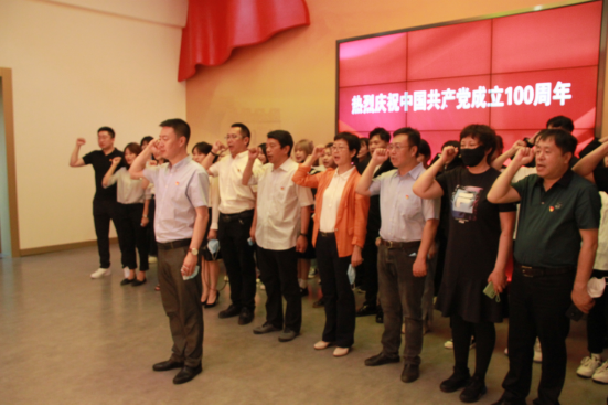 “誓言厅”正中央悬挂着鲜艳的中国共产党党旗。在孙亮书记领誓下,全体党员面对党旗,举起右手,重温入党誓词。
