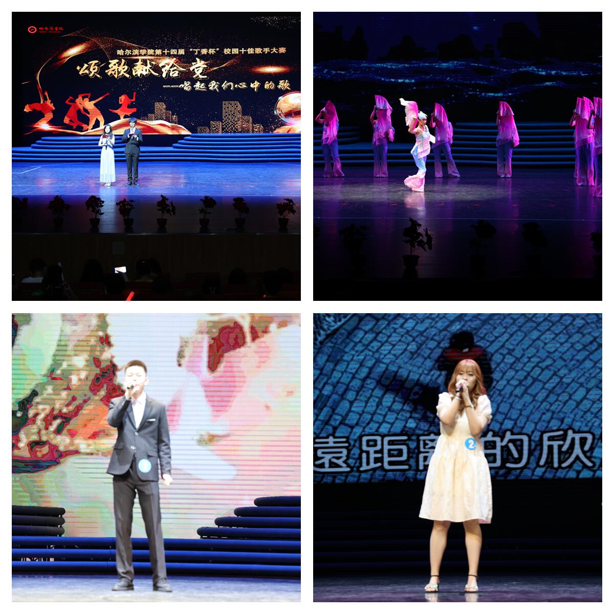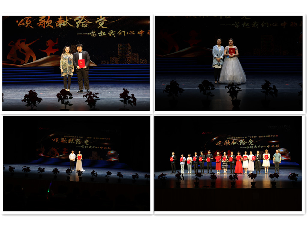 为庆祝中国共产党成立100周年,从党的百年历程中感悟时代力量,加强对学生的思想引导,丰富党史学习教育途径,6月23日12:30,以“颂歌献给党-唱起我们心中的歌”为主题的哈尔滨学院第十四届“丁香杯”校园十佳歌手大赛在丁香剧场举行。音乐与舞蹈学院副院长赵薇教授,副院长沈丹副教授,韩杨老师担任本次比赛评委,校团委工作人员及二级学院师生共计600余人观看了比赛。