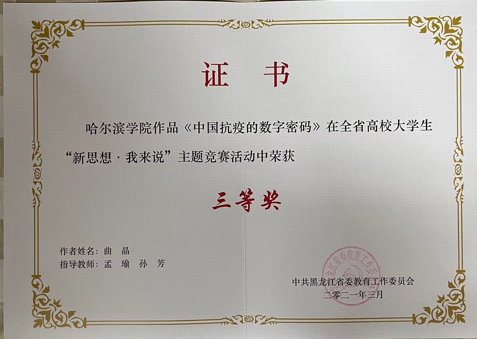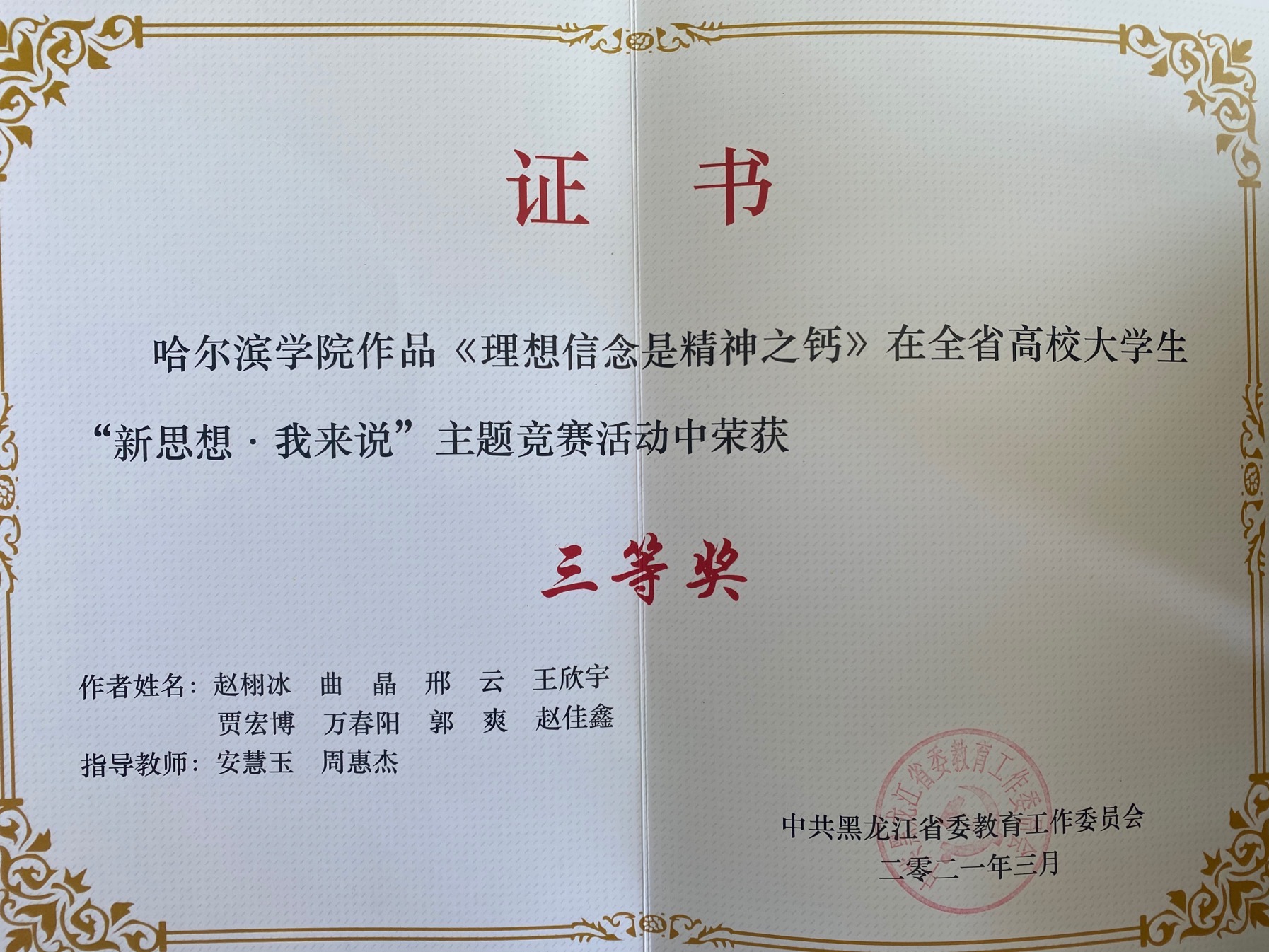 马克思主义学院领导高度重视此次活动,认真部署,层层推进,精心组织师生参与实施,不仅投入大量经费邀请超星公司为参赛学生制作符合参赛标准要求的影像作品,并指派专门老师负责学生作品的指导。此次参赛作品共推荐2项,《理想信念是精神之钙》(作者:赵栩冰,指导教师:安慧玉、周惠杰)和《中国抗疫的数字密码》(作者:曲晶,指导教师:孟瑜、孙芳),从题材的选择到最终文本的敲定,都经过了师生共同的修改与反复的打磨,最终2部作品均获三等奖,马克思主义学院也获得了优秀组织奖。