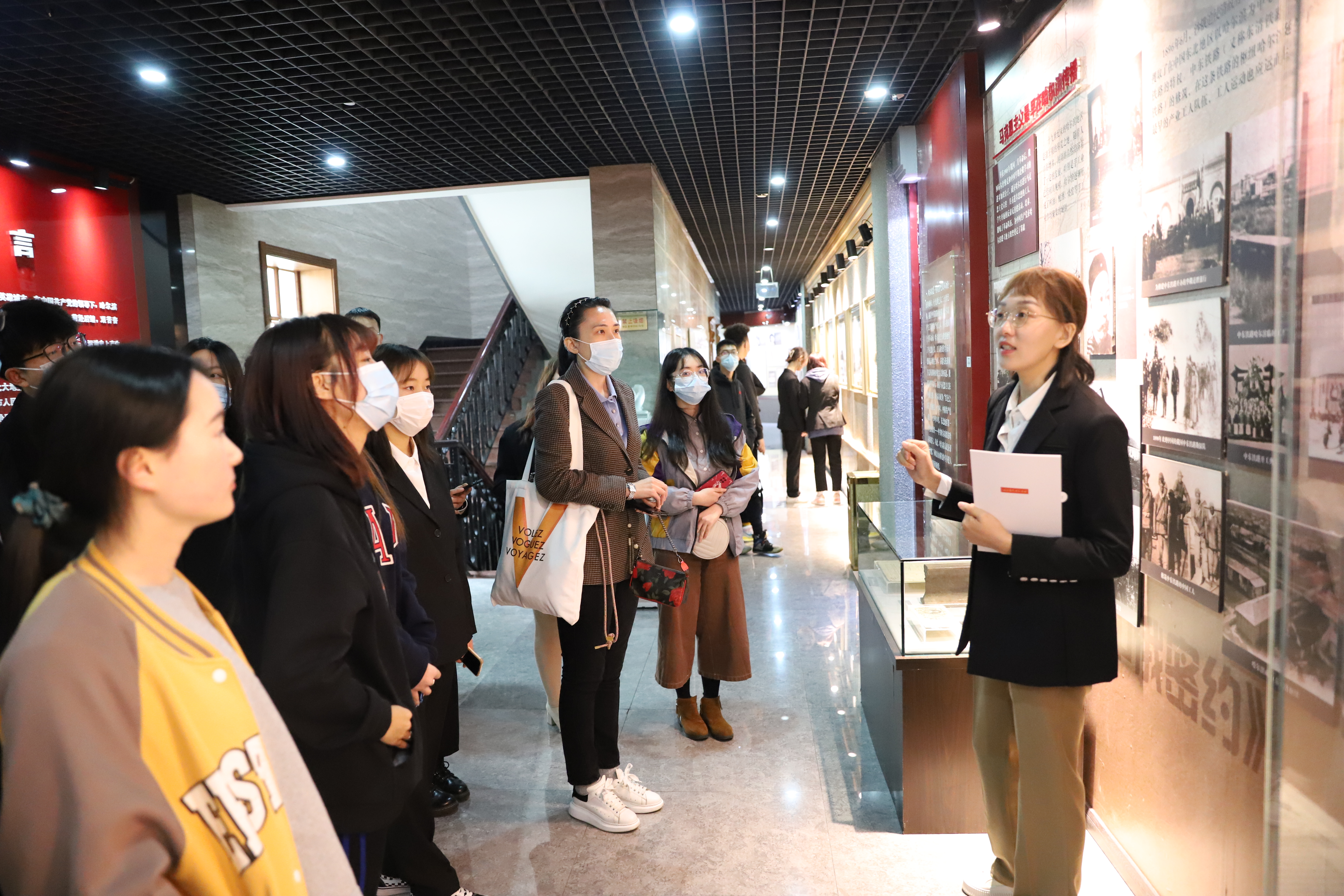 启动仪式后,“红旗实践团”与“爱微益社团”一同前往哈尔滨党史纪念馆进行参观学习活动。活动过程中,习近平新时代中国特色社会主义思想概论课教研室主任顾博老师,结合党史纪念馆的展厅资料,进行了“哈尔滨党史”的现场教学。