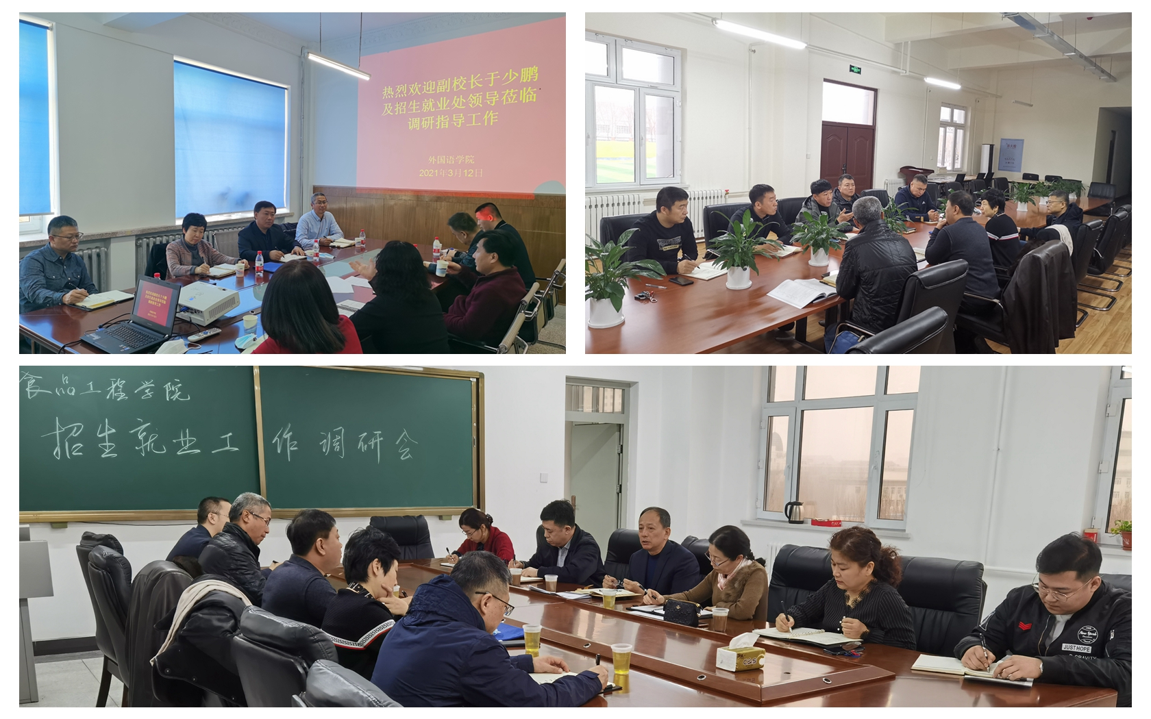 为推动学校2021届毕业生就业工作深入开展,3月11日至3月18日,于少鹏副校长先后走访了11个学院、约谈1个学院,调研指导工作。期间,通过听取汇报、座谈交流、问题解析等方式,了解了各学院2021届毕业生就业进展情况、重点和难点问题、以及下一步工作设想,重点传达了学校党政主要领导对就业工作的要求,达到了进一步统一思想、迎难而上、推进2021届毕业生就业工作稳步开展的目的。招生就业处处长丛军、副处长张成强和李业明参加了调研。