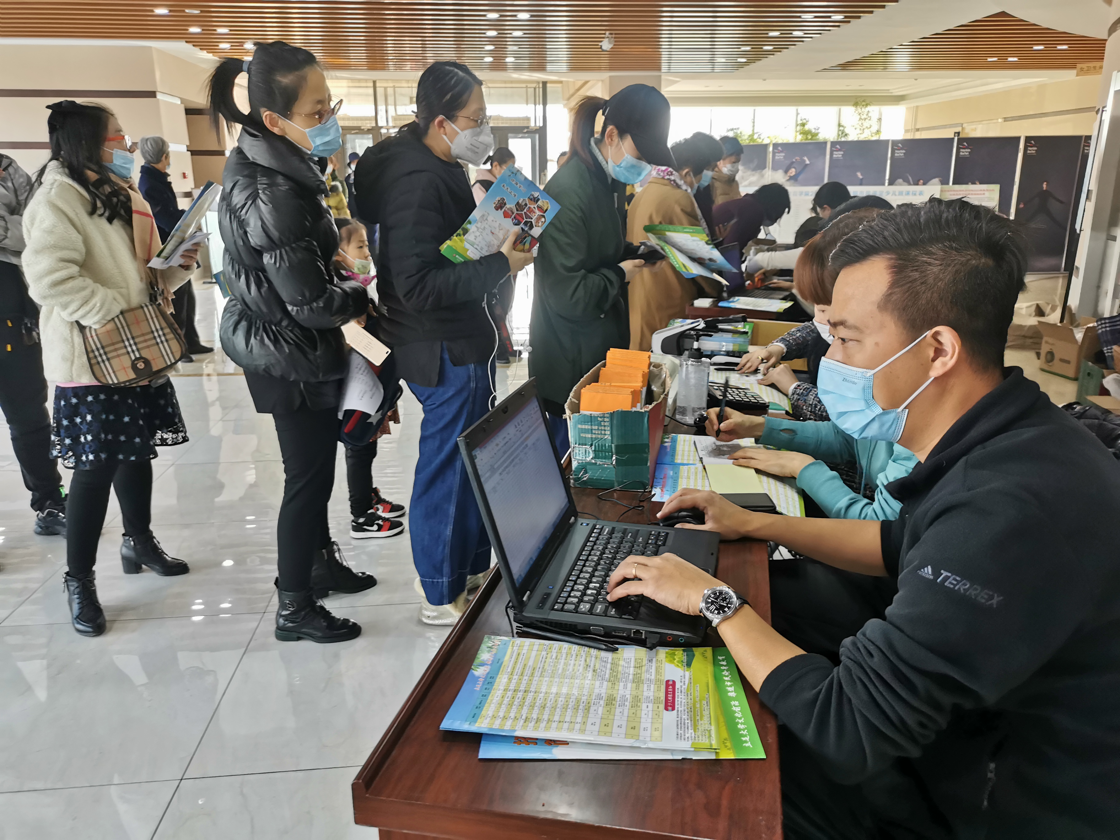 3月14日,继续教育学院2021年春季学期“市民课堂”终身教育课程迎来首个报名日。早上7点30分,几百名学员早早的来到报名现场,按照疫情防控的相关要求,他们在工作人员的组织下,根据学科班级指示牌保持合理间距等候入场,经过测温和扫码后分组分批进行报名,秩序井然有序。
