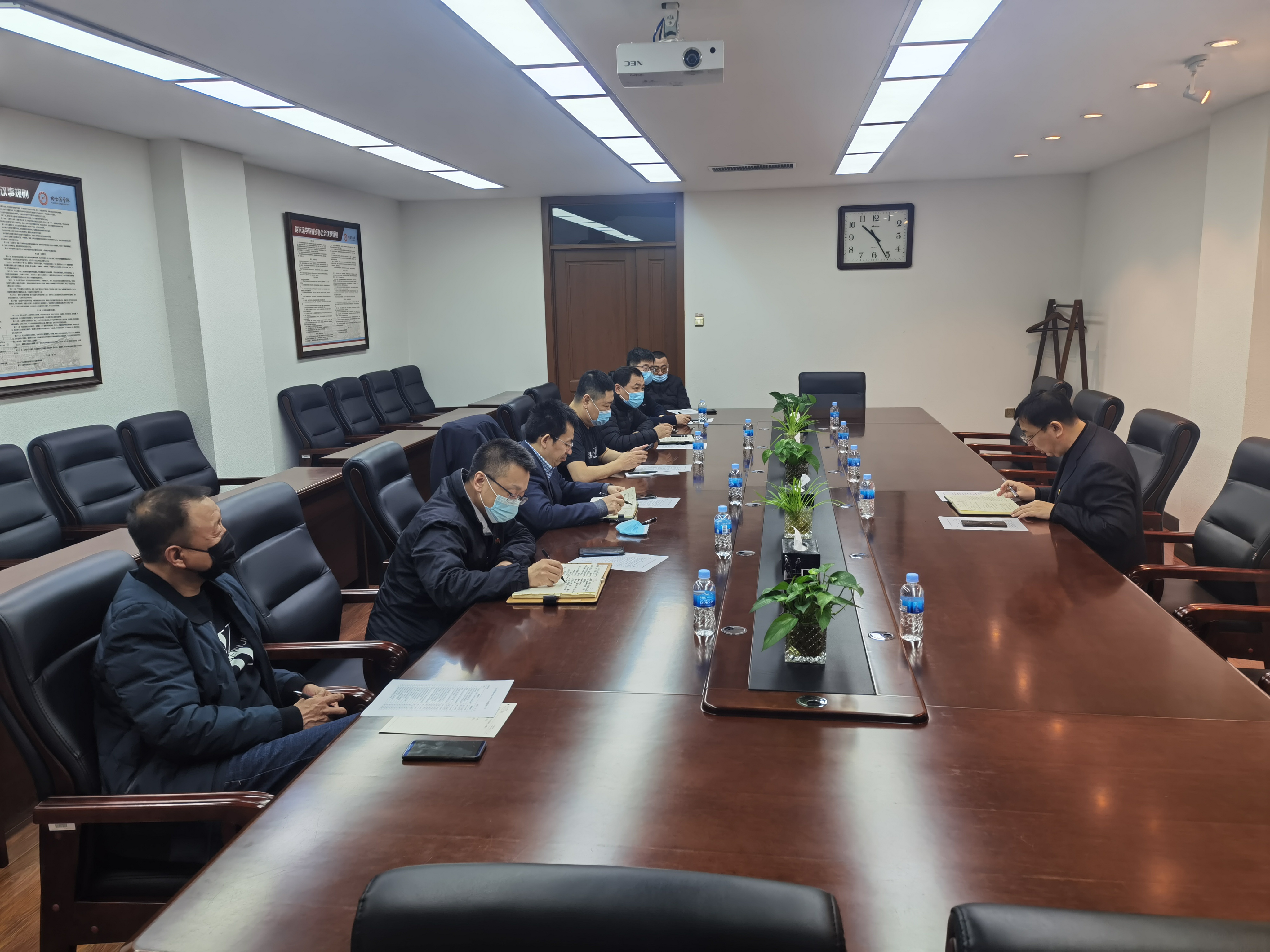 考察结束后,孙红镱副校长在党政办公楼306会议室主持召开会议,传达3月7日上午的全省大中小学校(幼儿园)2021年春季学期开学工作调度会议精神和党委书记冯延平、校长胡宝忠的工作要求。孙红镱副校长强调,必须提升站位,进一步强化政治意识、风险意识和问题意识。要进一步压实责任,强化整改,确保开学季任务目标落实落靠。在压实责任方面,要确保每个链条、每个事项都有人负责;压实师生员工个人的责任,坚持全员抓、抓全员。在强化整改方面,要突出重点抓整改,聚焦重点人群、重点岗位和关键环节强化“精细”排查,聚焦应急处置、实战演练强化“精准”防控,聚焦校园封闭管理等方面,进一步在“精细”服务上下功夫。会上,孙红镱副校长对开学以来学生返校、开学复课、学生上网课情况和隔离点学生的动态摸清底数,掌握数据,详实了解情况,并对照2021年学校开学疫情防控工作检查问题清单逐一进行问题排查,针对疫情防控薄弱环节的重点难点问题,及时帮助协调解决。孙红镱副校长还对新冠疫苗接种、校园环境整治等工作进行了布置。