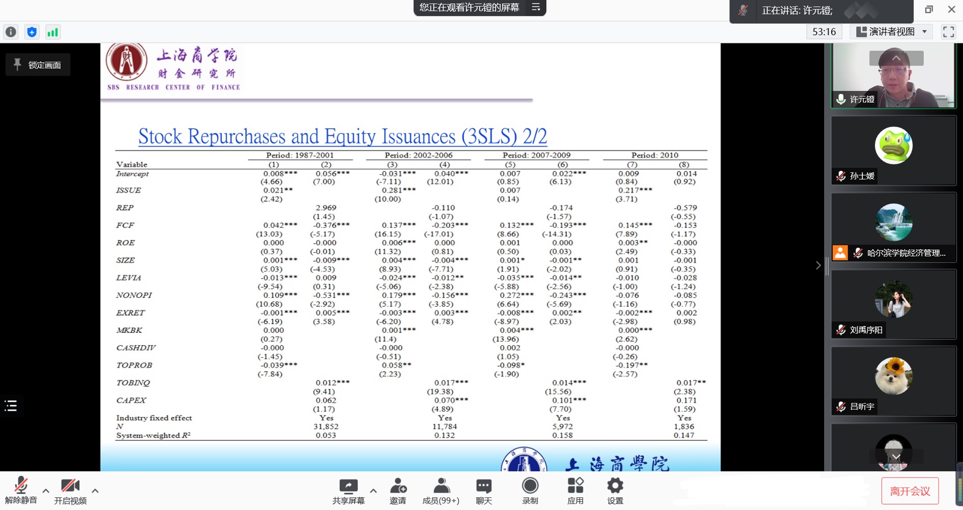 讲座中,许博士以其发表的《为何公司改变股票回购的行为》论文为例,对撰写SSCI期刊的学术论文的选题背景、研究假设、数据获取、研究结论及理论贡献等方面的撰写过程进行了详细阐释和分析。讲座后,结合师生们的提问,许博士又与师生们分享了SSCI期刊的选择、与审稿人的交流、稿件的修改等投稿环节的经验,并针对研究题目的确定、论文撰写的思路与逻辑、刊物选择的方向等方面提出了宝贵建议。