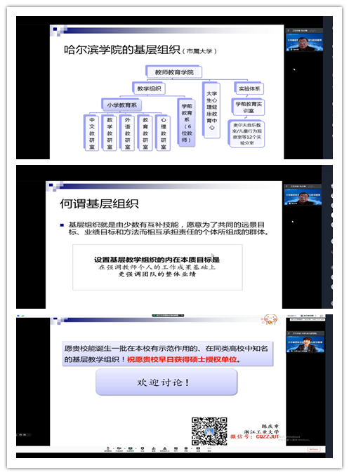为进一步贯彻教育部高教司关于加强高校基层教学组织建设相关文件精神,积极推进我校“教学立校”行动计划、落实学校2021年工作要点相关部署,大力加强我校基层教学组织建设,激发基层教学组织活力,3月24日下午,教师教学发展中心邀请浙江工业大学教授、博士生导师、浙江省优秀教育工作者陈庆章作了题为《大学基层教学组织建设与教学管理》的专题报告。本次报告采取二级学院集中观看直播与教师线上自主观看相结合的方式进行。教务处处长田野、教学质量评估中心主任李惠男,各二级学院院长、教学副院长、系(部)主任、专业负责人、教研室主任、教学团队负责人、课程组负责人、教学秘书,相关职能部门领导及教师教学发展中心工作人员参加了本次活动。报告由教师教学发展中心副主任宋阔主持,超星学习通平台进行了同步网络直播。