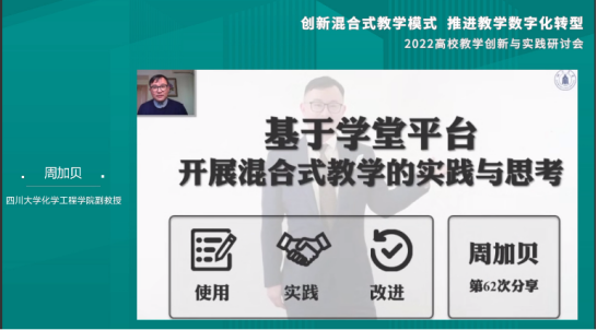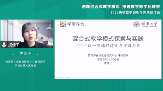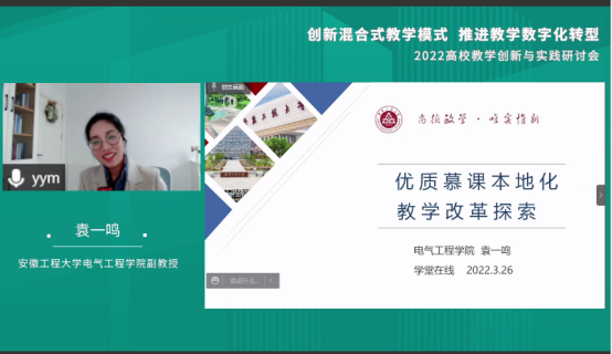 研讨会历时近三个小时,共有5场主题报告。分别是:教育部在线教育研究中心课程顾问、学堂在线大区经理虎佳子的《混合式教学模式探索与实践——一一流课程申报为例》、河北工业大学本科生院常务副院长马岱的《工业大学线上线下混合式教学模式的研究与实践》、清华大学医学院副教授裘莹的《基于SPOC的混合式教学经验分享》、四川大学化学工程学院副教授周加贝的《基于学堂平台开展混合式教学的实践与思考》、安徽工程大学电器工程学院副教授袁一鸣的《优质慕课本地化教学改革探索》。报告人分别以所教授的具体课程为实例,从一流课程申报、线上线下混合式教学创新、SPOC课程教学建设、教学工具与平台应用、数字教育资源优化等实践视角,阐述了混合式教学模式改革与创新理念,分享了教育信息化战略发展背景下教育教学改革及促进有效教学的实践经验。