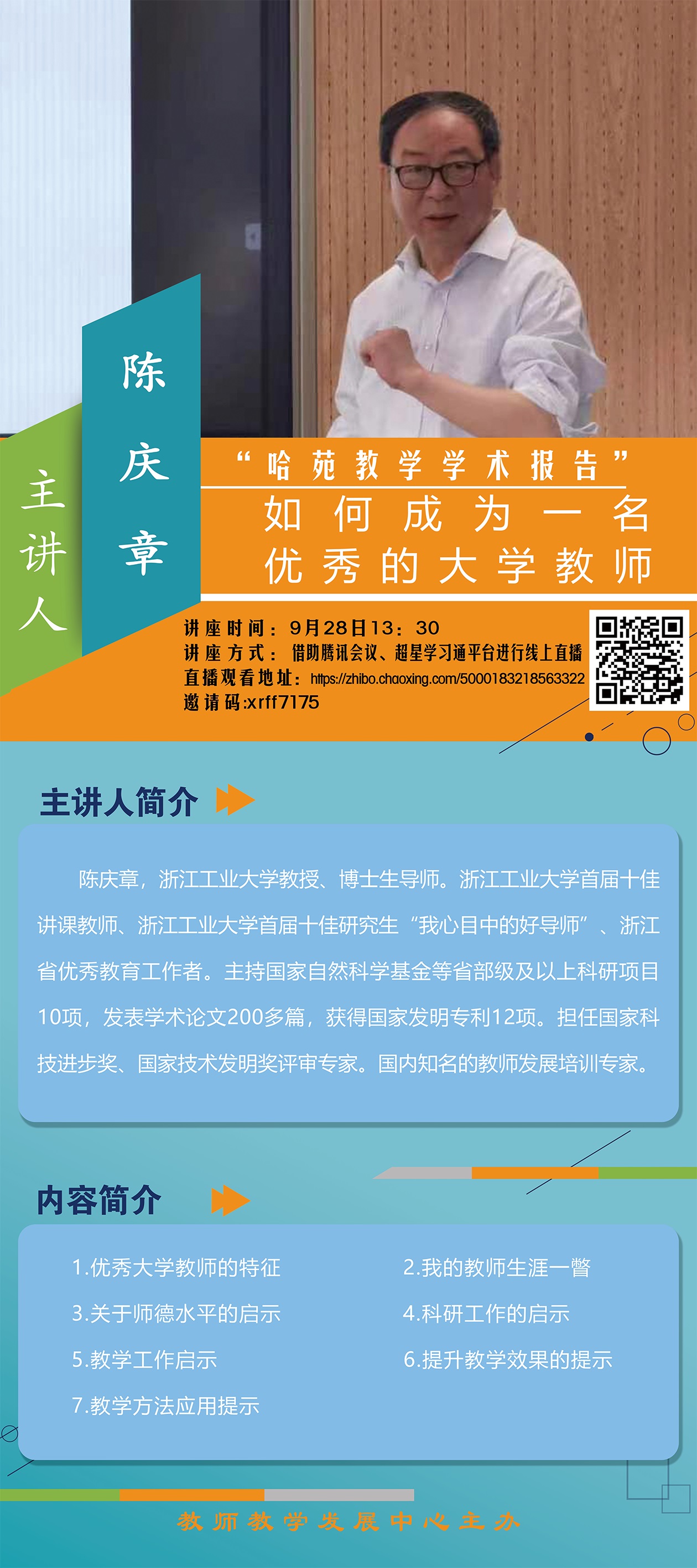 教师教学发展中心邀请浙江工业大学博士生导师陈庆章教授作题为《如何成为一名优秀的大学教师》的专题报告。欢迎各位老师踊跃参加!