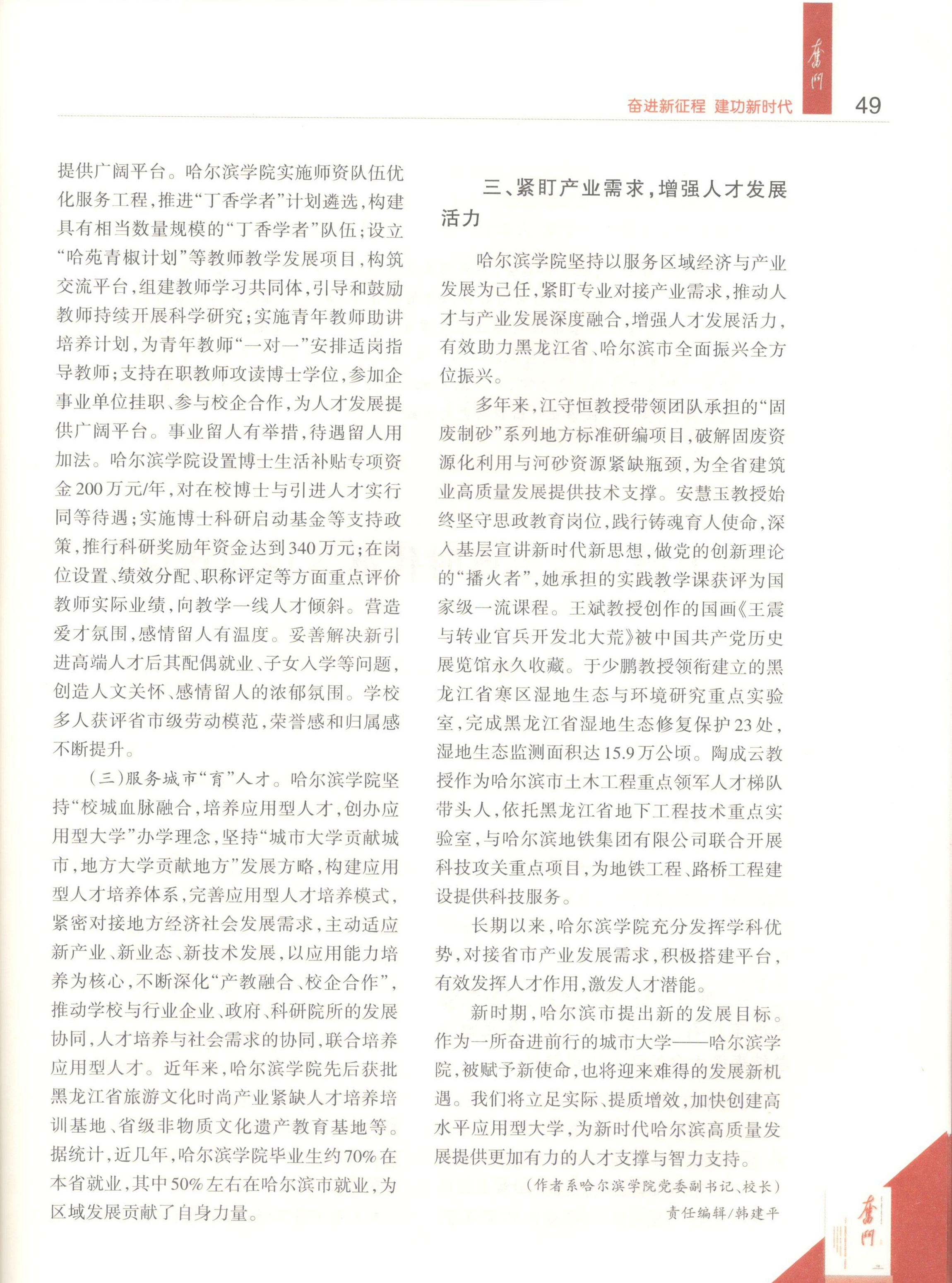 (文/邢珺)近日,在中国共产党黑龙江省委员会主管主办的综合性理论刊物《奋斗》杂志2022年第8期上,我校校长于成学同志发表署名文章:《为哈尔滨高质量发展积蓄“人才动力”》。文章指出,哈尔滨学院认真学习领会习近平总书记关于人才工作的重要思想,全面贯彻落实中央、黑龙江省委人才工作会议精神,持续深化人才工作改革创新,构建“大人才”工作格局,提高人才聚集效能,增强人才发展活力,担负城市大学助力哈尔滨市高质量发展的责任与使命。文章紧密联系实际,全面深刻阐述了我校充分发挥学科优势,对接省市产业发展需求,积极搭建平台,有效发挥人才作用,激发人才潜能取得的工作成效和经验。
