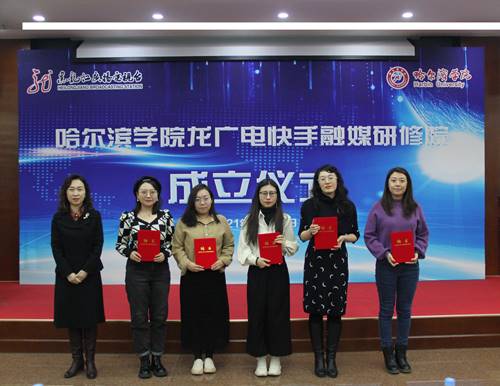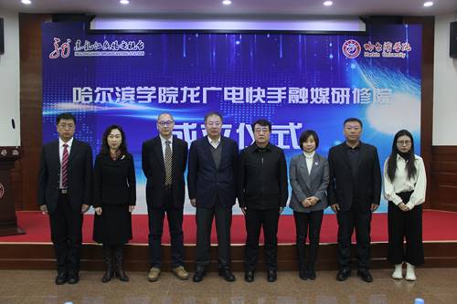 哈尔滨学院校长于成学、黑龙江广播电视台总编辑李皎共同为“哈尔滨学院龙广电快手融媒研修院”揭牌。