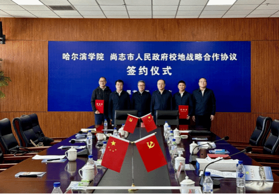 宋国利与王新国代表校地双方签订《哈尔滨学院与尚志市人民政府校地战略合作框架协议书》。学校与尚志市将在人才引进培养、教育教学培训、项目交流合作、创新创业平台搭建、地域特色产品设计研发、品牌形象宣传推广等创意设计赋能经济发展领域建立长效合作机制。