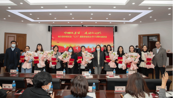 纪委书记马弘莉、副校长宋国利、副校长吴旭峰为三八红旗手获得者颁奖