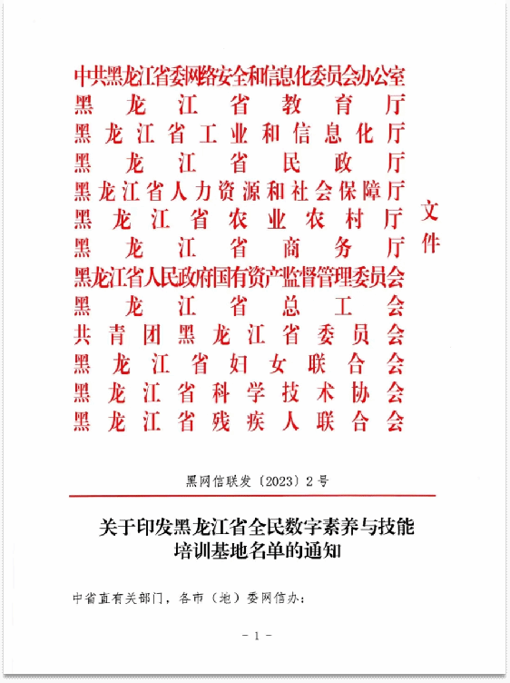为深入实施《黑龙江省提升全民数字素养与技能行动实施方案(2022-2025年)》,按照《关于开展全民数字素养与技能培训基地申报工作的通知》要求,经中省直有关部门和各市(地)网信办初选推荐、专家评审、部门审核、网上公示等环节,省委网信办会同省教育厅、省工信厅、民政厅、省人社厅、农业农村厅、商务厅、省国资委、省总工会、团省委、省妇联、省科协、省残联联合评选确定我校为2023年黑龙江省全民数字素养与技能培训基地。
