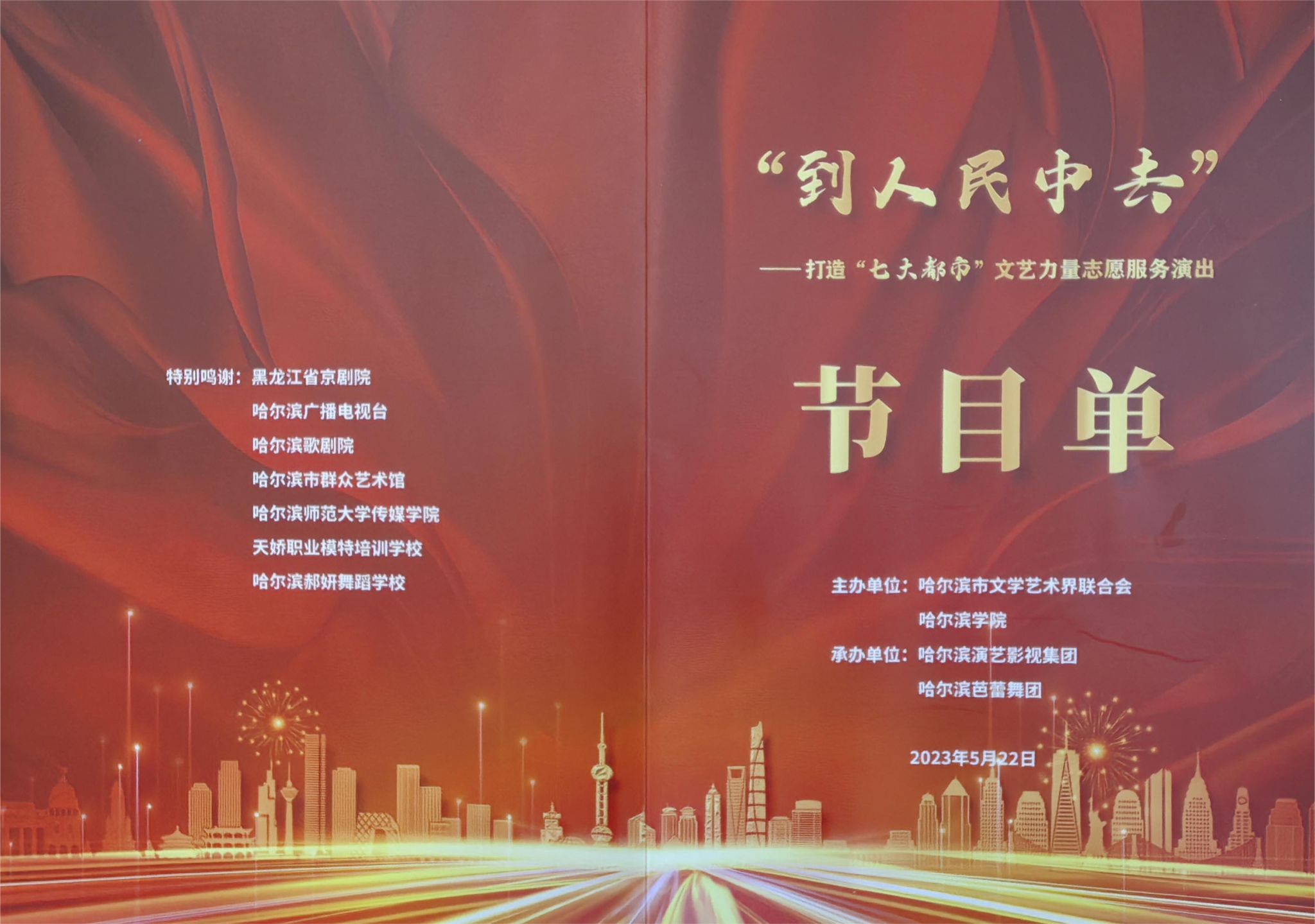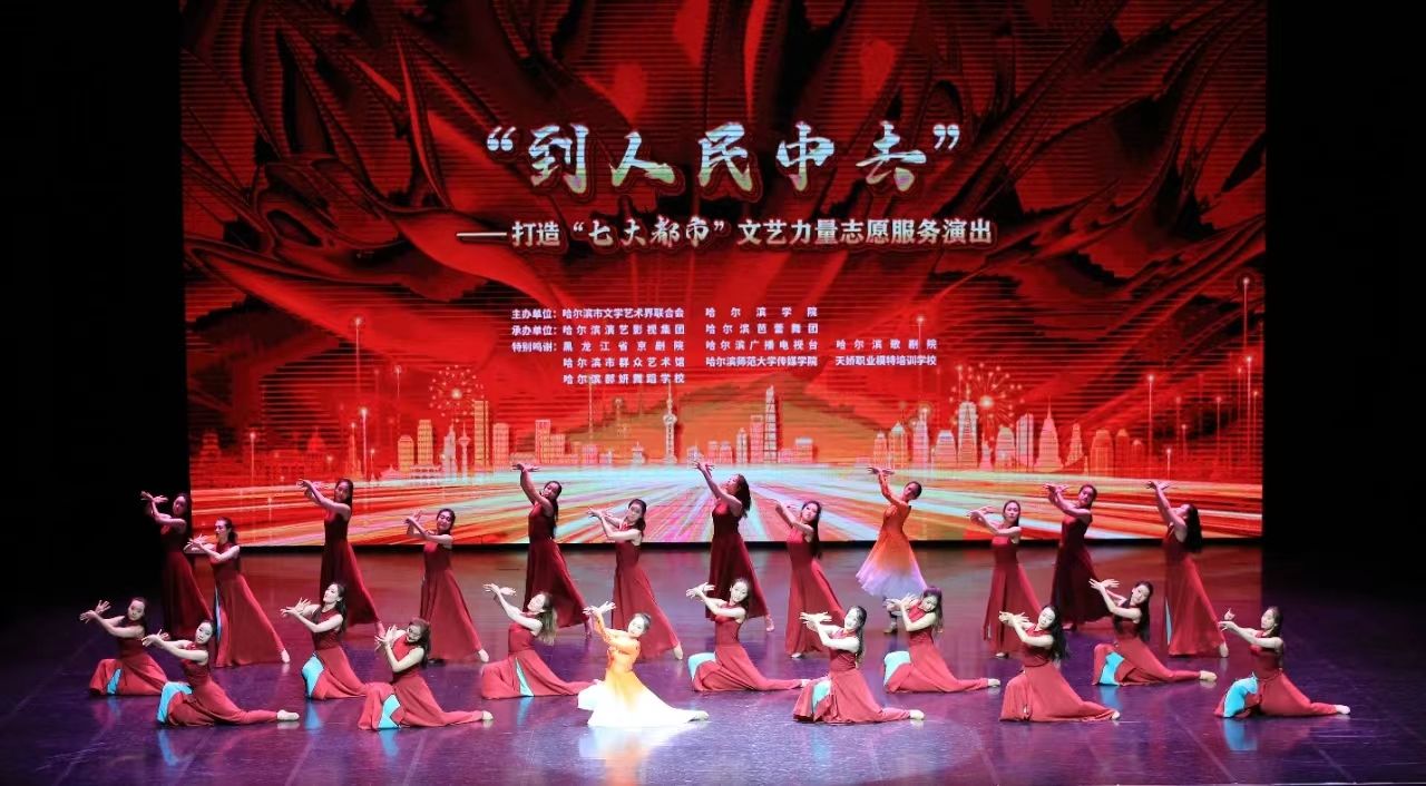 (文/邢珺、李晓欢)围绕深入开展学习贯彻习近平新时代中国特色社会主义思想主题教育和深化能力作风建设“工作落实年”活动,聚焦我市打造“七大都市”奋斗目标,5月22日下午,由哈尔滨市文联、哈尔滨学院主办,哈尔滨演艺影视集团、哈尔滨芭蕾舞团承办的“到人民中去”——打造“七大都市”文艺力量志愿服务演出在我校丁香剧场圆满举办。省文联、市委宣传部、市委统战部、市直机关工委、市网信办、市教育局、市财政局、市文广旅局、市卫健委、市总工会、团市委、市妇联、市歌剧院、市群众艺术馆等省、市直单位有关负责人,市委主题教育第二巡回指导组和第十五巡回指导组部分成员参加活动。学校党委副书记李娜,党委宣传部部长李铁岩、副部长朱明,芭蕾舞团党委书记王晓峰,校团委负责人张玉娟及800余名师生代表观看演出。