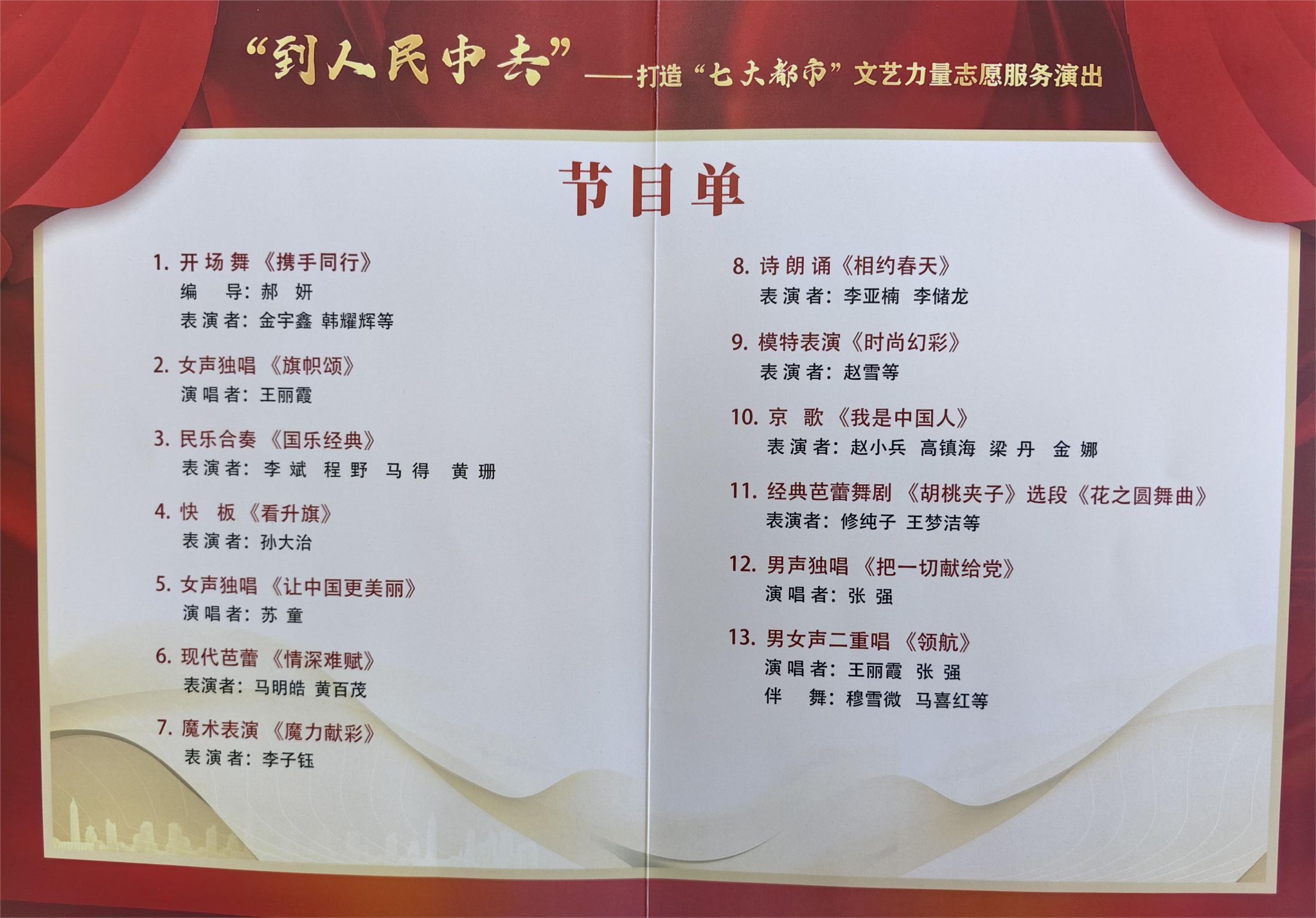 演出分为《旗帜飘扬、携手同行》《蹲厉奋发、笃行不怠》《百花齐放、精彩未来》三个篇章,13个节目涵盖了歌曲、戏剧、民乐、舞蹈、曲艺、朗诵、模特等多种艺术形式,节目选材和内容呈现在坚持弘扬主旋律、传递正能量的同时,注重贴近现实生活,也注重为“文艺两新”搭建展示风采的舞台。开场舞《携手同行》激情昂扬的舞姿展现了我市“文艺两新”听党话、跟党走的坚定信心;歌曲《旗帜颂》《让中国更美丽》《把一切献给党》《领航》和京歌《我是中国人》,大气磅礴、深情激荡、鼓舞人心,奏响了同心向党、奋斗筑梦的时代之声;民乐合奏《国乐经典》、模特表演《时尚幻彩》、芭蕾舞《情深难赋》《花之圆舞曲》展现了东方传统文化与西方经典艺术的完美融合,彰显了文化自信,传递了精神之美;快板《看升旗》、魔术表演《魔力献彩》通过师生喜闻乐见的艺术形式,为观众带去欢声笑语,现场掌声阵阵、气氛热烈;诗朗诵《相约春天》娓娓道来、饱含深情,向大家发出邀约,邀请大家乘着“七大都市”的“春风”,相约在哈尔滨,相约在绚烂的春天里。
