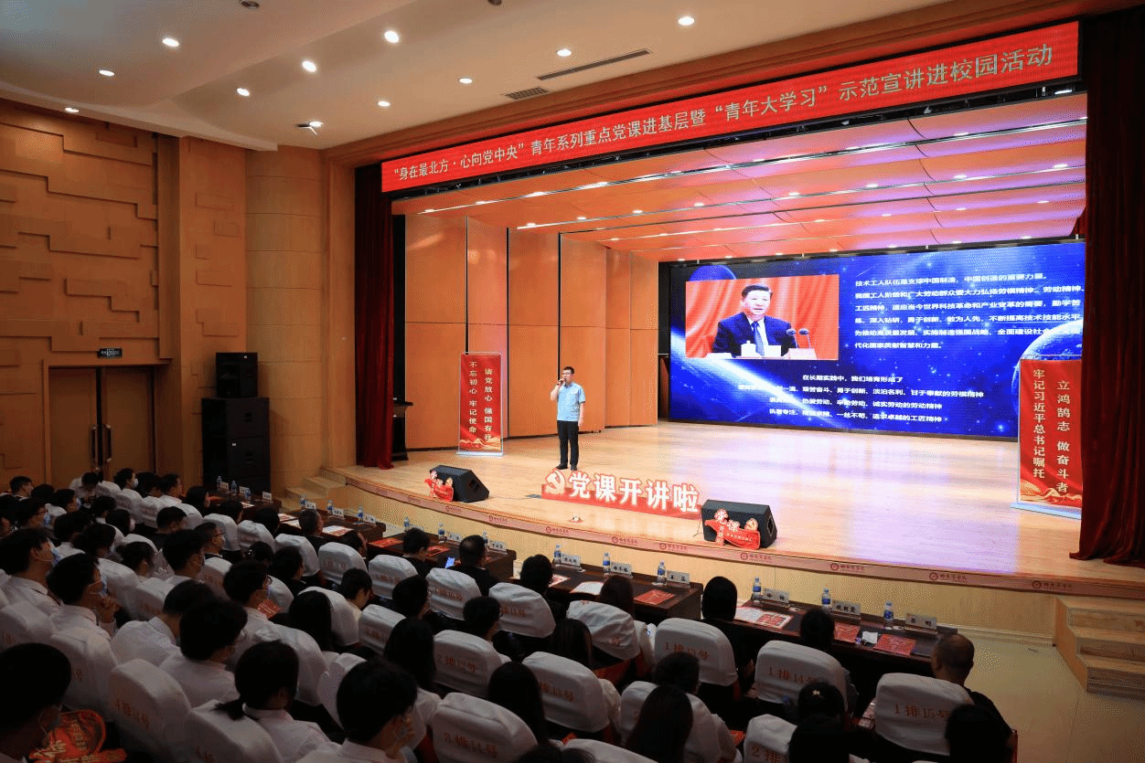 (文/张玉娟)为深入学习贯彻党的二十大精神和习近平总书记关于青年工作的重要讲话、重要指示批示精神,高质量服务习近平新时代中国特色社会主义思想主题教育,按照省委组织部关于打造“身在最北方·心向党中央”党员线上教育课程体系的统一部署,6月2日,由哈尔滨市委组织部、哈尔滨团市委主办,哈尔滨学院、哈尔滨广播电视台协办的青年系列重点党课进基层暨“青年大学习”示范宣讲进校园活动在我校举办。