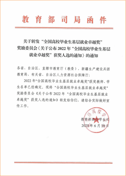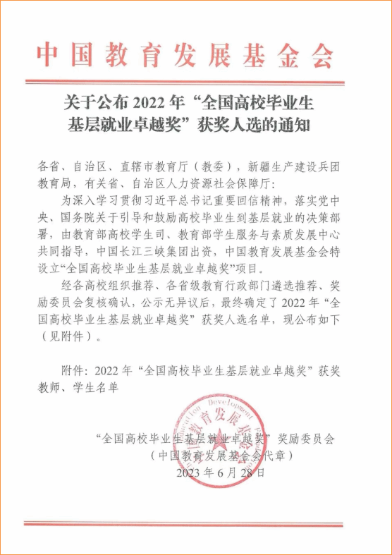 据悉,“全国高校毕业生基层就业卓越奖”由教育部高校学生司、教育部学生服务与素质发展中心共同指导,中国长江三峡集团出资,中国教育发展基金会设立项目,奖励对象为近10年全国高校赴基层就业并做出突出业绩的优秀毕业生和指导服务大学生赴基层就业的教师,该项目每年遴选一次。