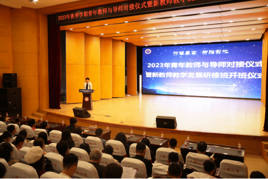 (文/宋阔、周晶)为深入贯彻落实习近平总书记在我省视察期间的重要讲话重要指示精神和关于建设教育强国的重要论述,认真执行《中共中央国务院全面深化新时代教师队伍建设改革意见》等文件要求,帮助我校新入职教师尽快融入学校、胜任岗位、加快成长,9月21日下午,由教师教学发展中心联合相关职能部门和二级学院开展的2023年秋季学期青年教师与导师对接仪式暨新教师教学发展研修班开班仪式在音乐与舞蹈学院小音乐厅举行。校长、党委副书记于成学出席开班仪式并讲话,相关职能部门、二级学院领导和承担助讲培养工作的指导教师以及研修班全体学员100余人参加。仪式由教师教学发展中心主任宋阔主持。