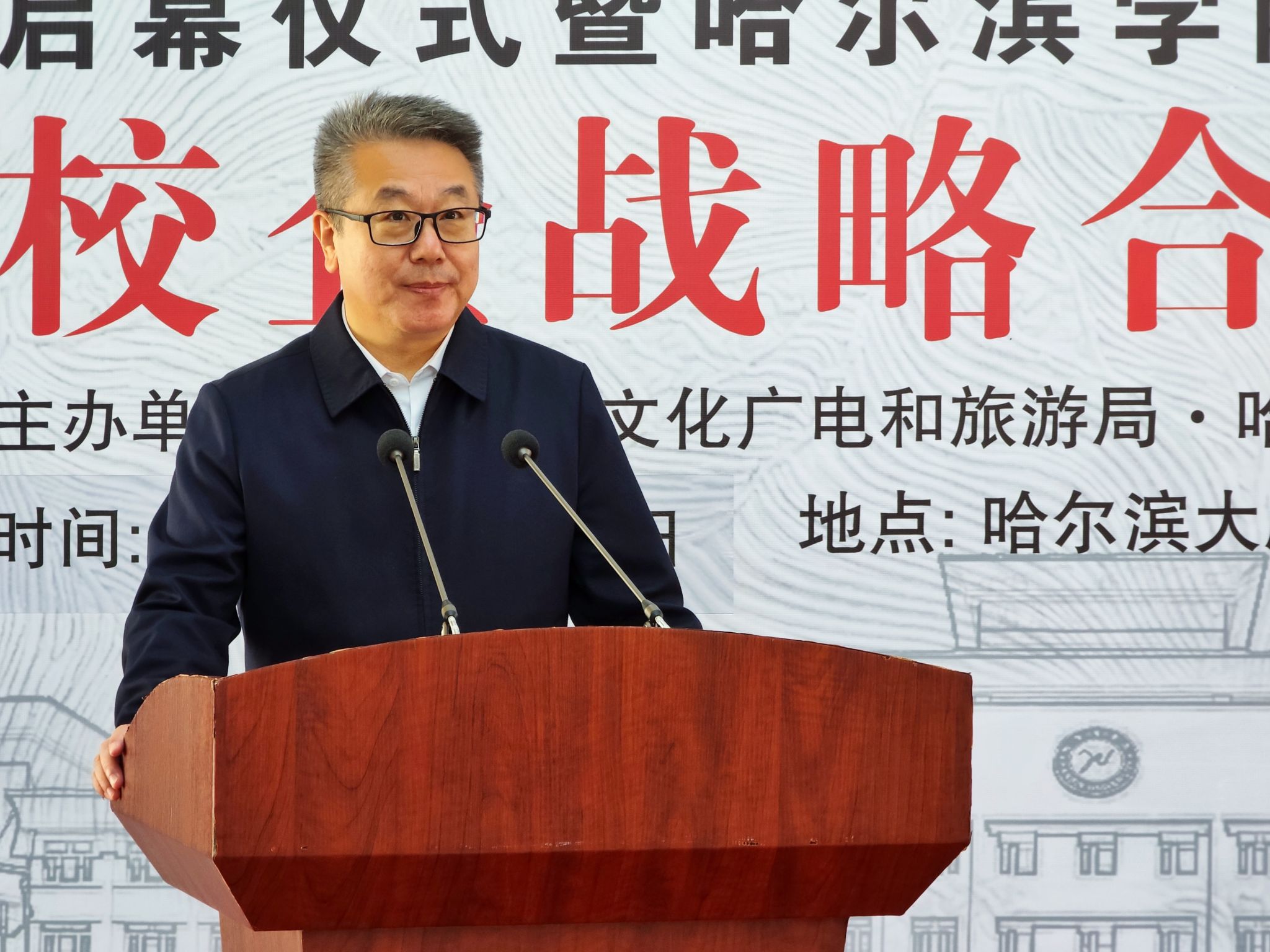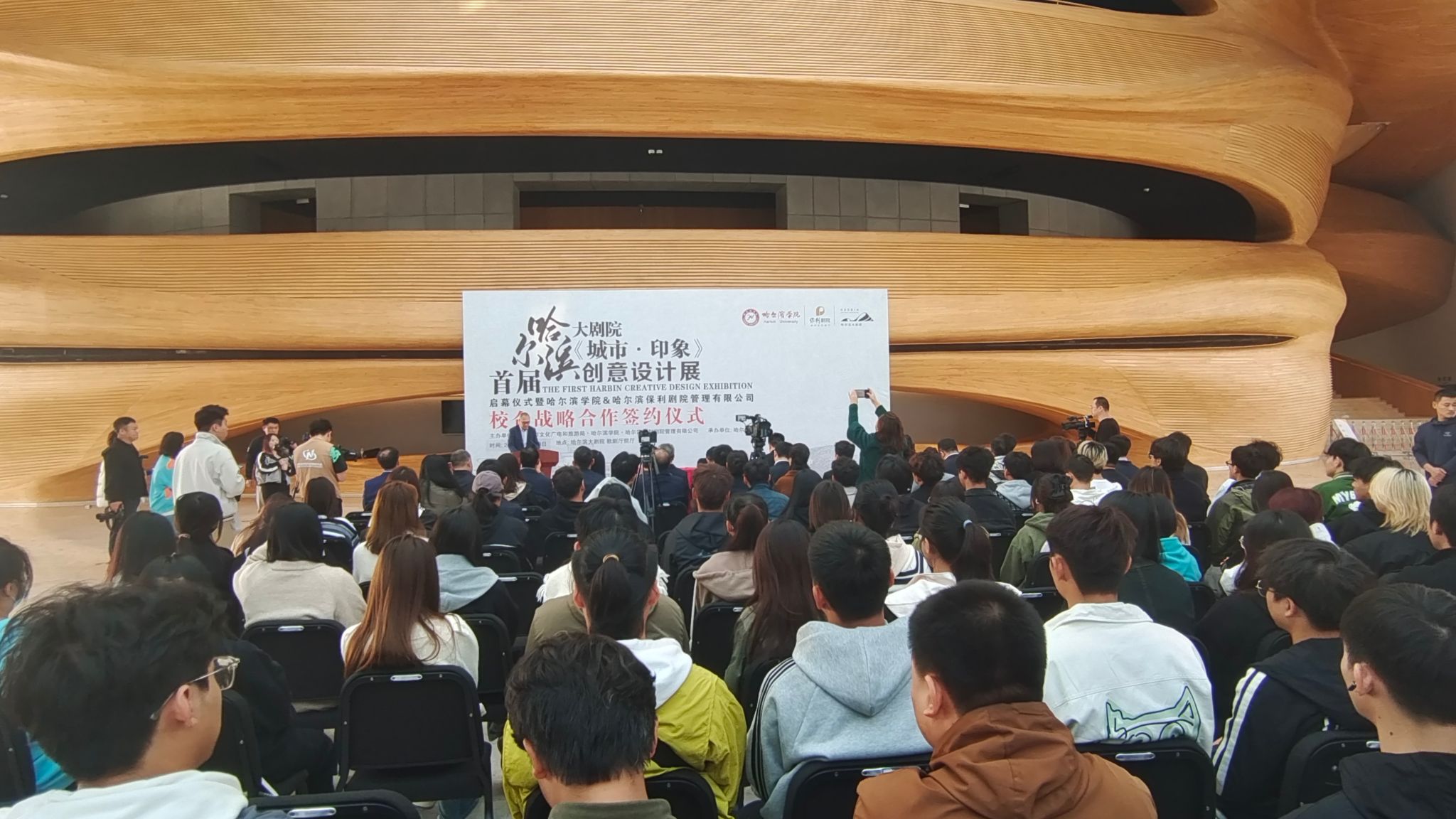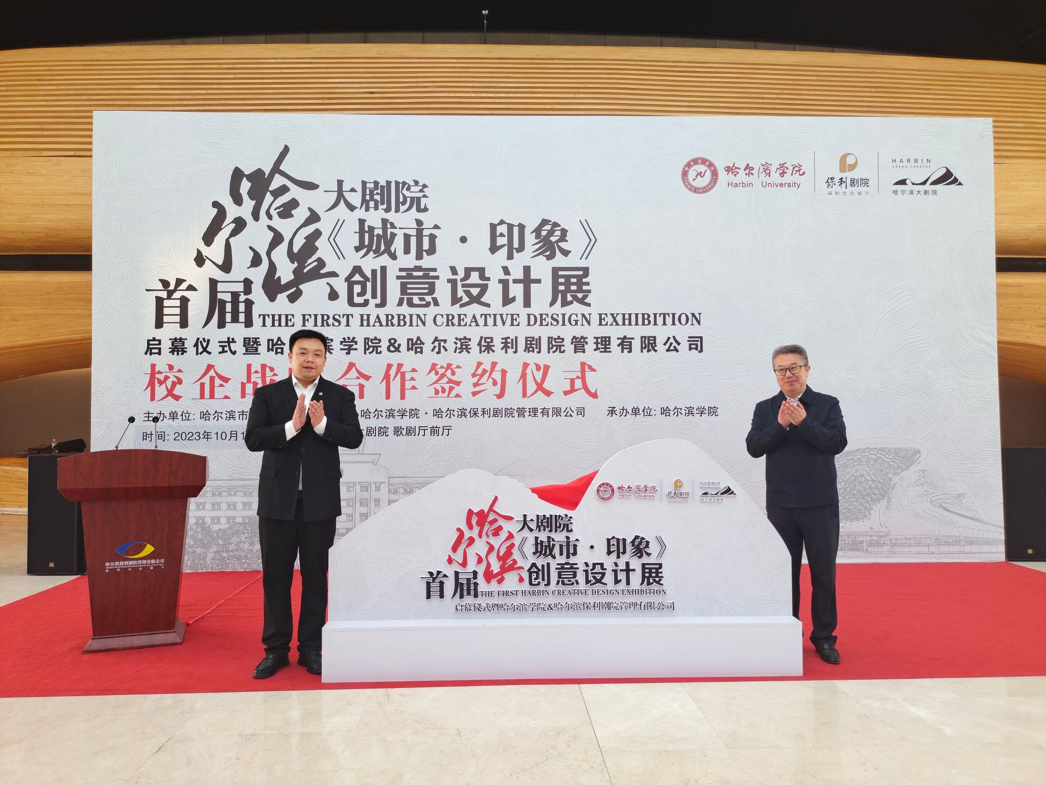 苍松、许迅为首届哈尔滨大剧院《城市·印象》创意设计展揭幕。宋国利、许迅代表双方签署了《校企战略合作框架协议书》。根据协议,校企双方将发挥各自资源优势,开展多学科、多领域交叉合作,不断探索校企协同育人新模式新机制,推进哈尔滨市文化旅游、创意设计产业高质量发展。