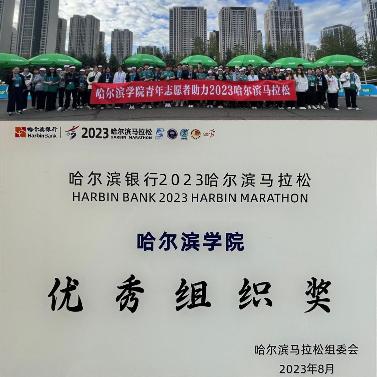 2023年8月志愿服务哈尔滨马拉松比赛并荣获哈尔滨银行2023哈尔滨马拉松优秀组织奖