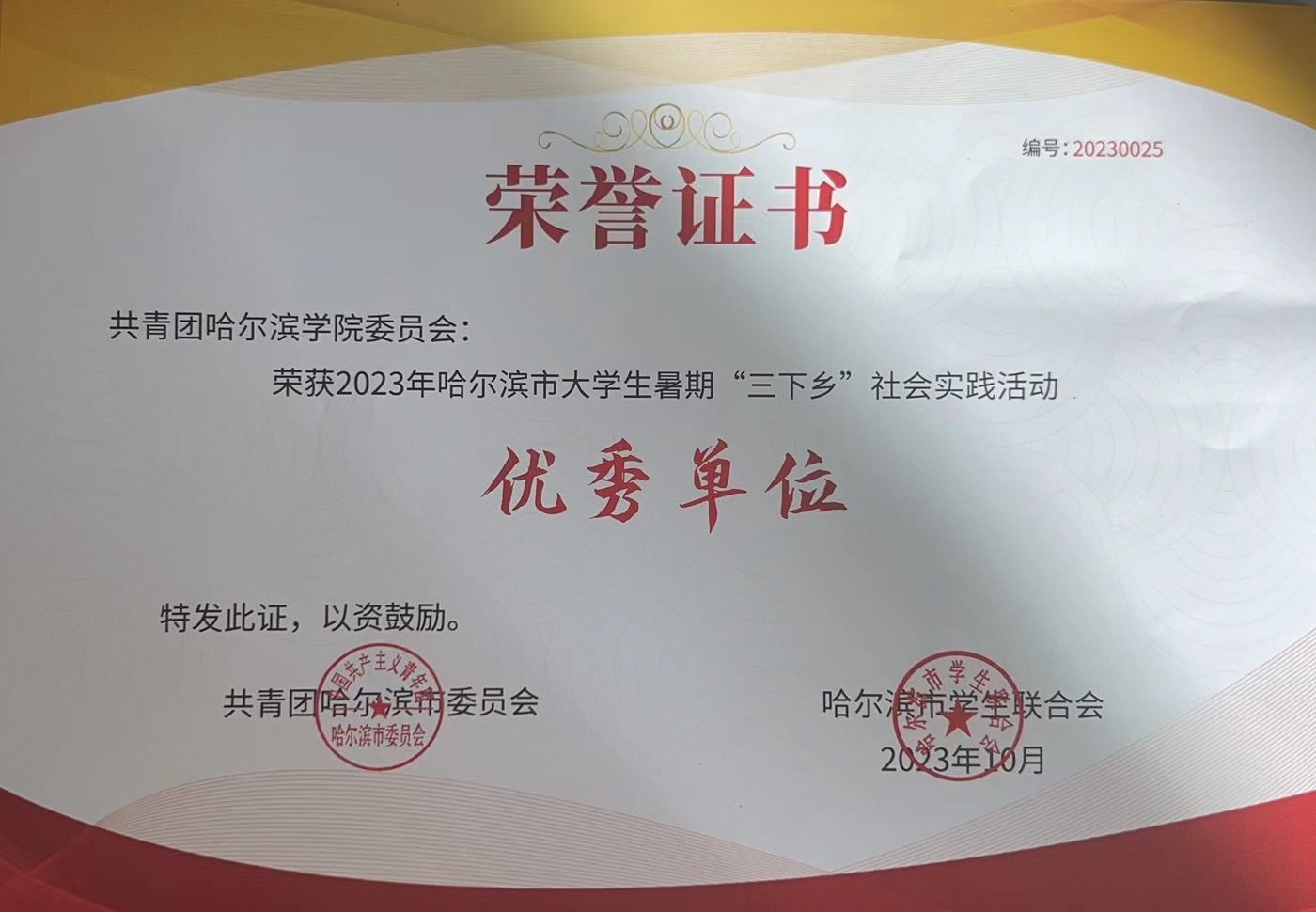 2023年10月荣获哈尔滨市大学生暑期“三下乡”优秀单位