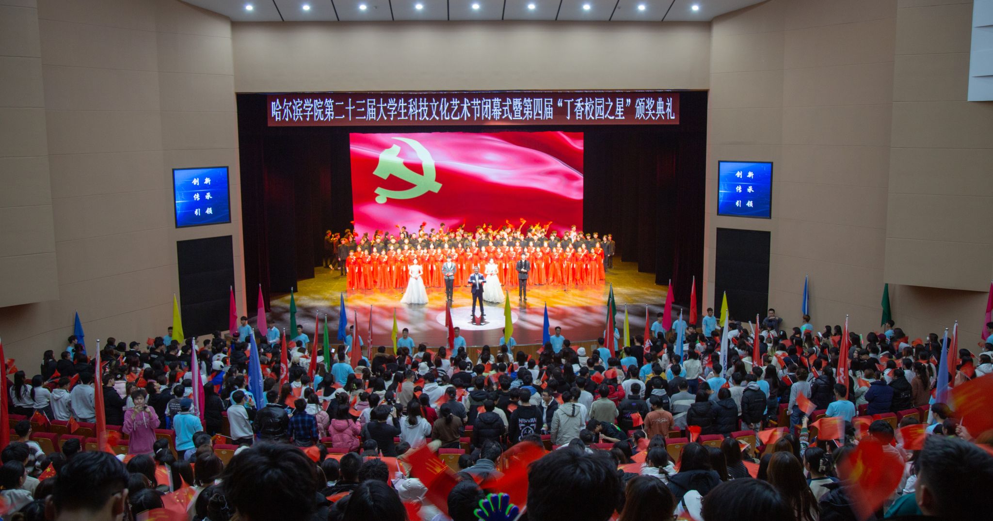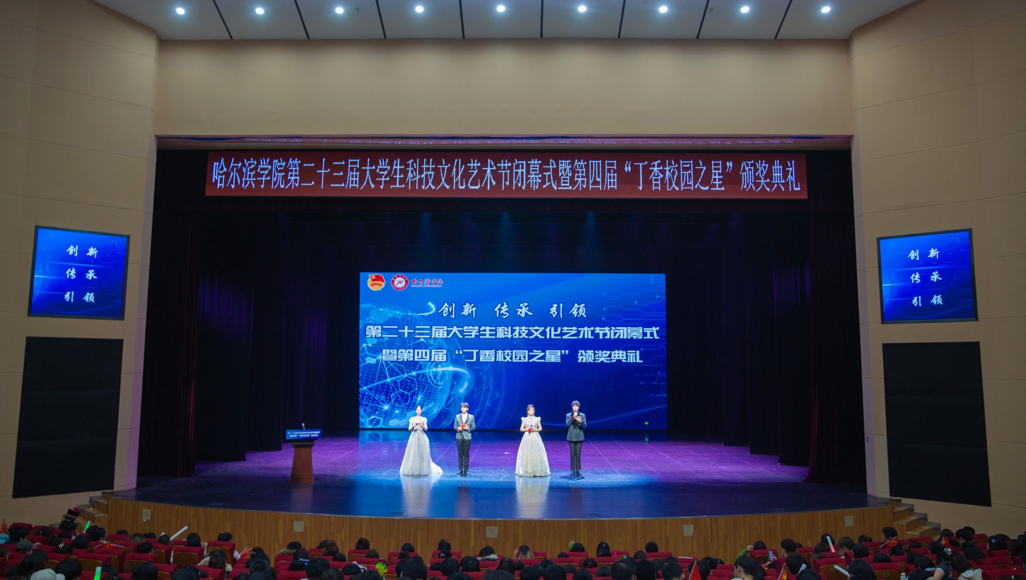 (文/李一宁)科技引领未来、文化沁润心灵、艺术丰盈生活。12月6日下午,哈尔滨学院第二十三届大学生科技文化艺术节闭幕式暨第四届“丁香校园之星”颁奖典礼在丁香剧场隆重举行。党委书记苍松,党委委员、副校长于少鹏,党委委员、副校长吴旭峰出席闭幕式并为获奖集体和个人颁奖。党委组织部、党委宣传部、党政办公室负责人、艺术节组委会成员、兄弟院校团委书记、相关职能部门负责人以及各学院院长、党委(党总支)书记、分团委书记、辅导员、学生代表参加闭幕式。