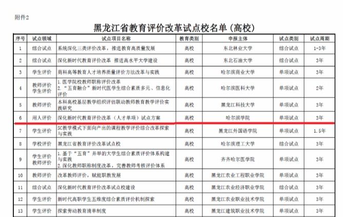 根据省委教育工作领导小组印发的《关于公布黑龙江省深化新时代教育评价改革试点名单的通知》,我省于2022年4月中旬组织开展各市(地)中小学及全省高校申报。学校高度重视此项工作,积极组织申报单项改革试点,由人事部门形成《哈尔滨学院深化新时代教育评价改革(人才单项)试点方案》及相关申报材料。经省教育厅审定,我校获批为黑龙江省教育评价改革试点高校。