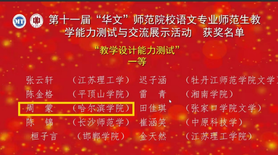 (文/周晓燕、毕丹丹)以赛促学增值赋能,以学促建提质培优。11月6日,第十一届“华文”全国师范院校语文专业师范生教学能力大赛圆满落幕,我校参赛选手荣获一等奖1项、二等奖6项、三等奖7项、优秀奖2项。