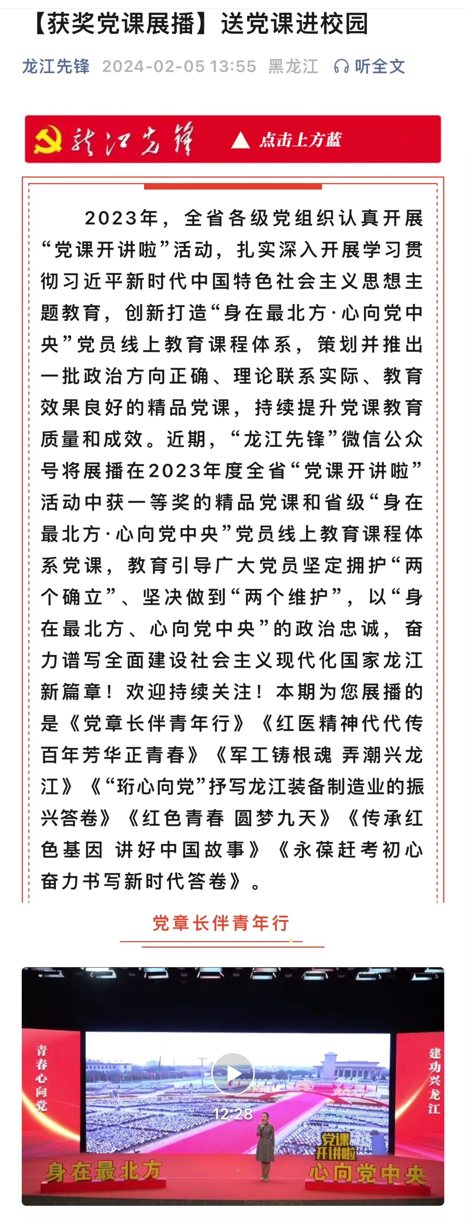 获奖党课正在“龙江先锋”微信公众号进行展播,党课主讲人孙芳以饱满的热情和深厚的理论素养,对党章进行了全面深入的解读。她结合青年学生的实际,通过生动的语言和鲜活的案例引导青年学生深刻领会党章的精神实质,自觉践行党章要求。