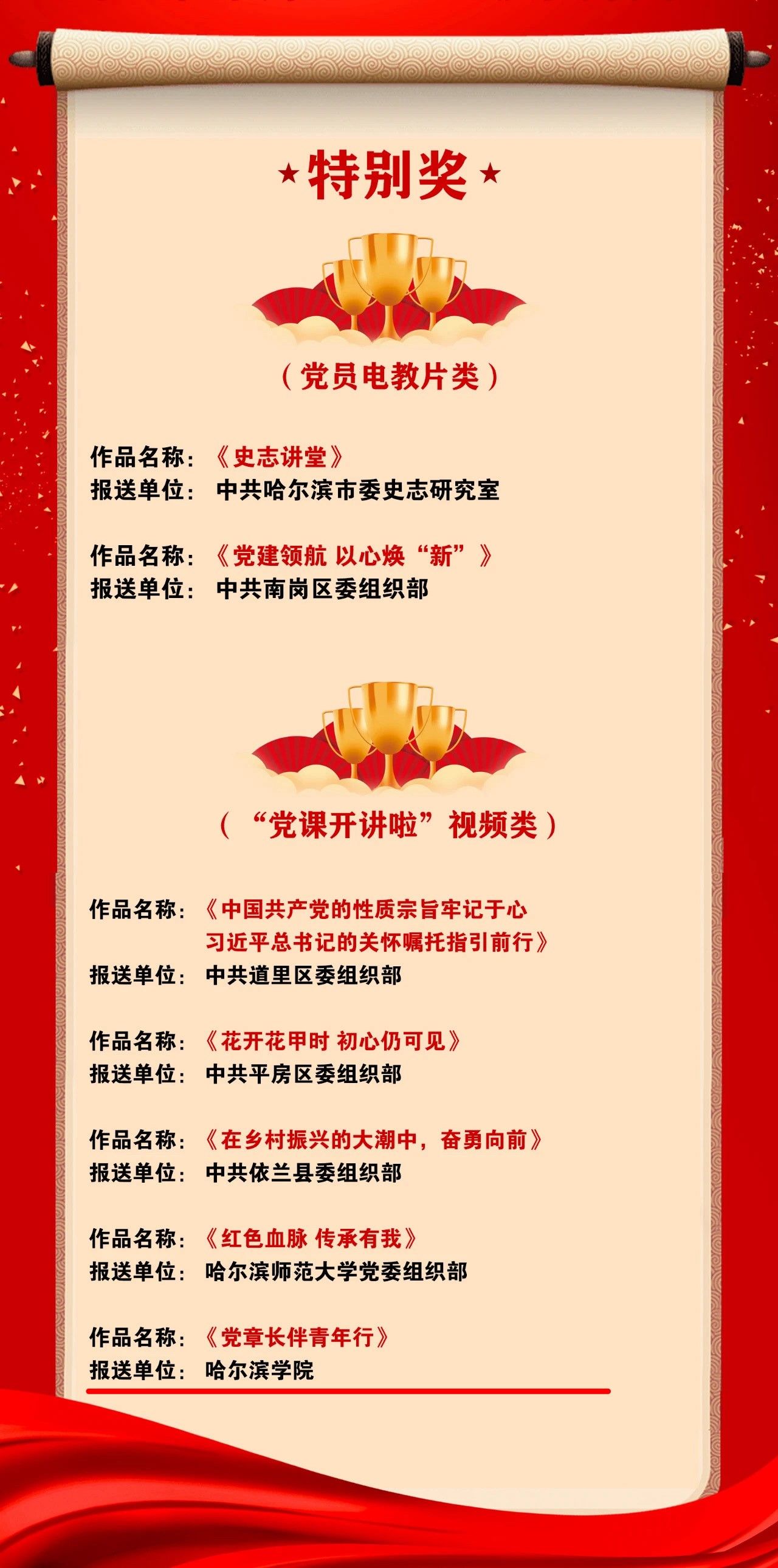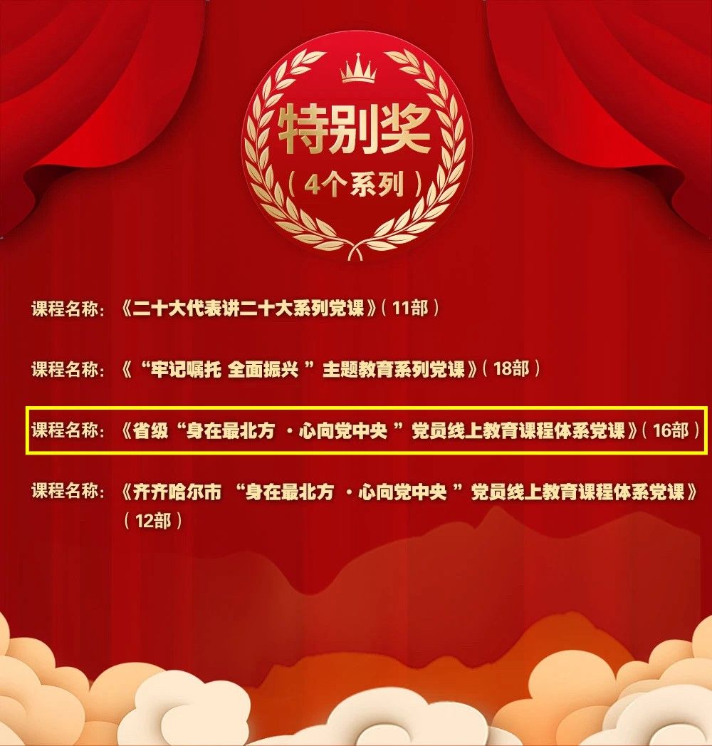 2023年度黑龙江“党课开讲啦”活动开展以来,全省各级党组织共推荐精品党课465部,经评审选出精品党课107部,其中特别奖4部。全市报送的作品共计8大类119件,最终评定出优秀作品56部,其中特别奖7部。