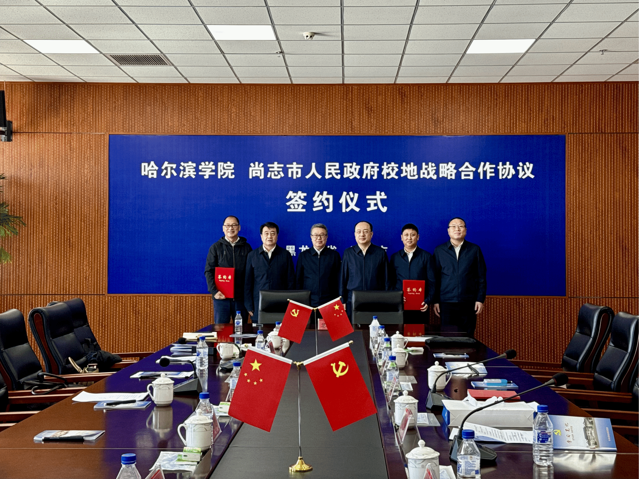 宋国利与王新国分别代表校地双方签订《哈尔滨学院与尚志市人民政府校地战略合作框架协议书》,学校与尚志市将在人才引进培养、教育教学培训、项目交流合作、创新创业平台搭建、地域特色产品设计研发、品牌形象宣传推广等创意设计赋能经济发展领域建立长效合作机制。