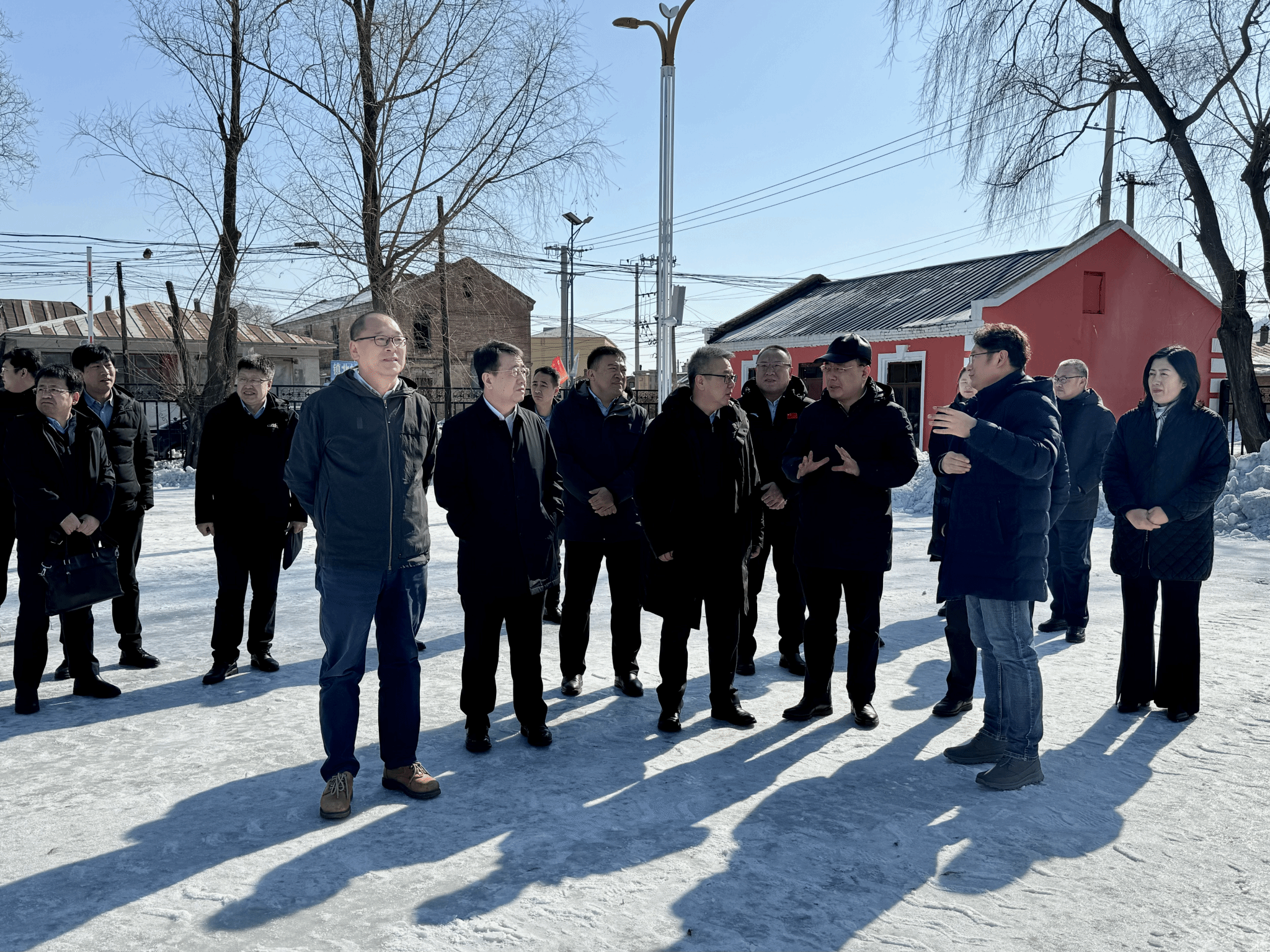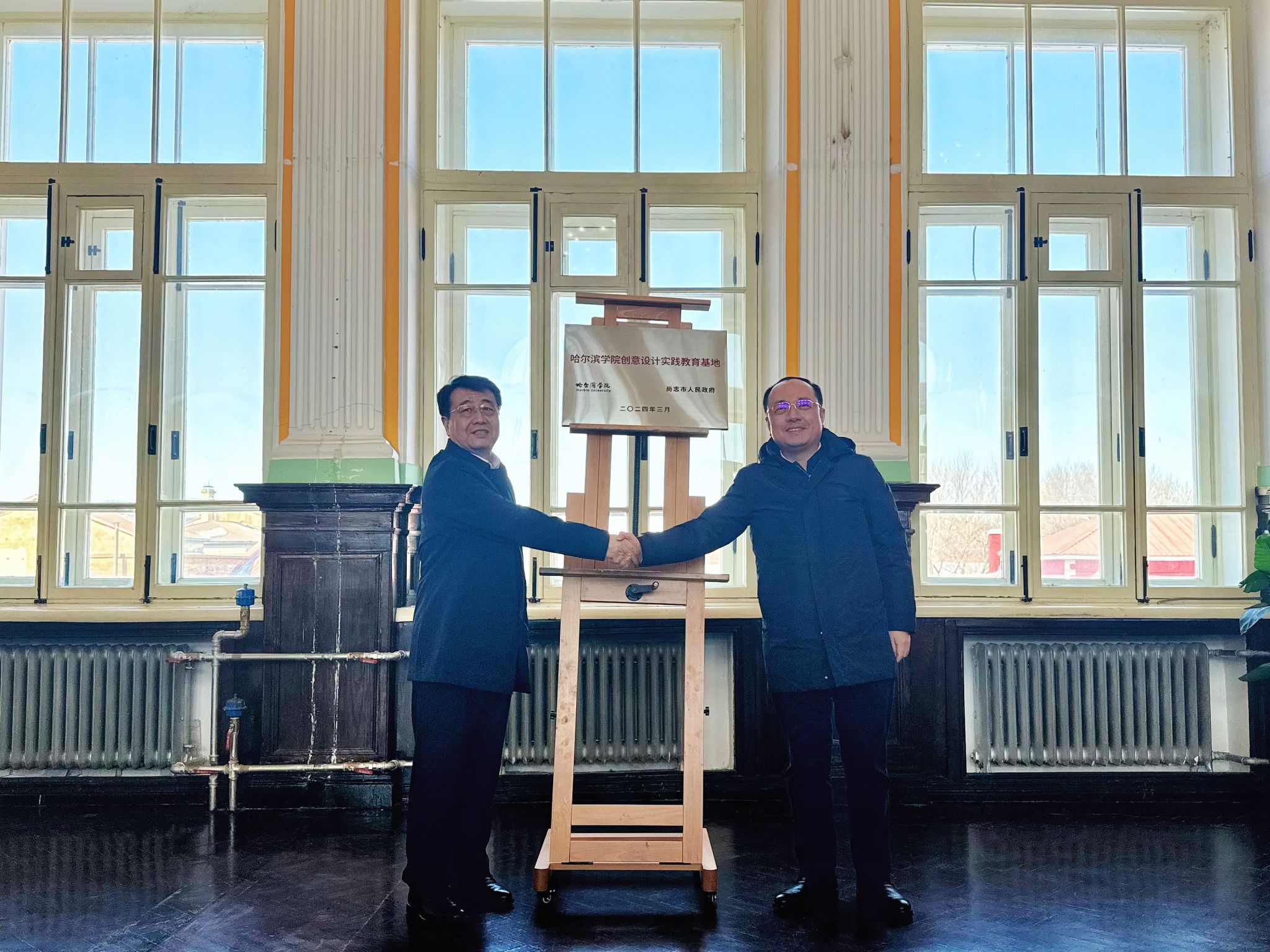 签约仪式前,苍松、于成学一行在刘海涛等陪同下调研考察了一面坡文化艺术小镇,并在该镇为“哈尔滨学院创意设计实践教育基地”揭牌。