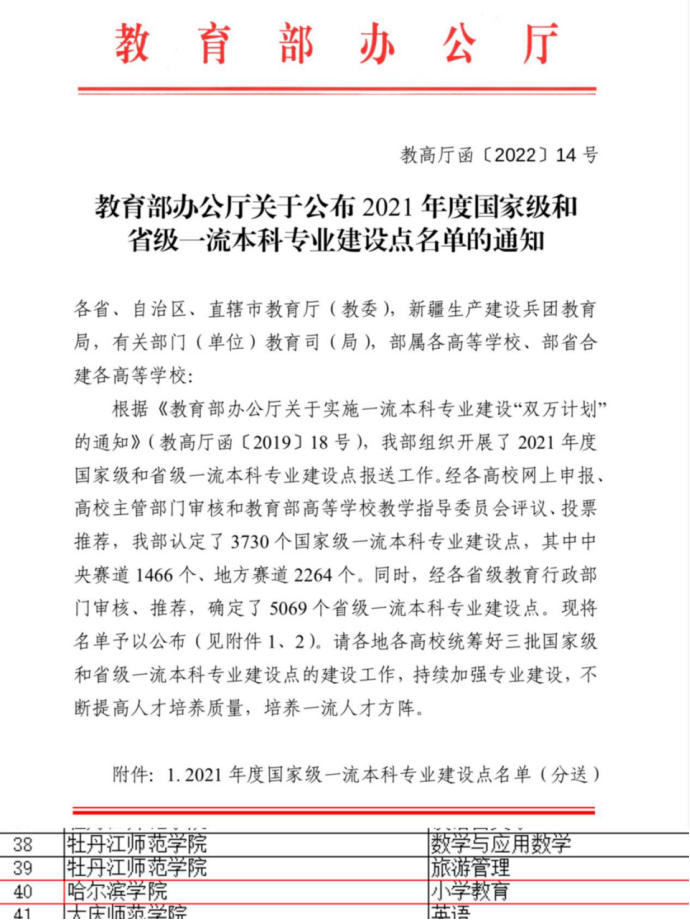 6月,小学教育专业入选国家级一流本科专业建设点,这是本校首个入选国家级一流本科专业建设点的专业。化学、地理信息科学、音乐学3个专业入选黑龙江省一流本科专业建设点。7月,数学与应用数学、音乐学两个专业顺利通过教育部普通高等学校师范类专业二级认证。学校现有国家级一流专业建设点1个,省级一流专业建设点12个,小学教育、数学与应用数学、音乐学三个专业通过师范类专业二级认证。