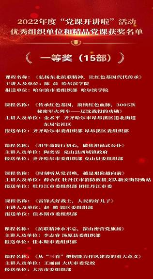 (文/刘瑶)1月7日,中共黑龙江省委组织部公布了2022年度“党课开讲啦”活动精品党课获奖名单。由我校选送、我校与中共哈尔滨市委组织部联合录制的党课《弘扬东北抗联精神,让红色基因代代传承》从全省各级党组织推荐的435部精品党课中脱颖而出,荣获一等奖。