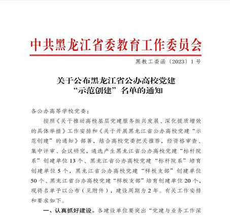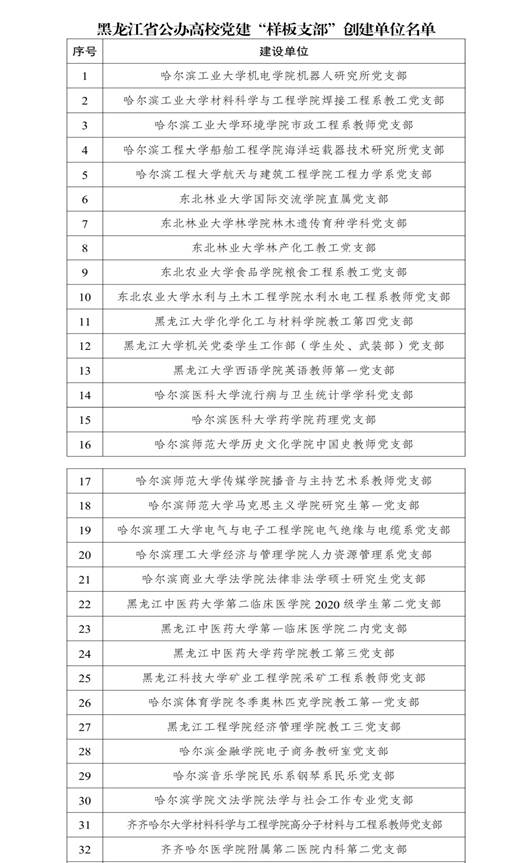 本批示范创建工作结合高校党委把关推荐,经资格审查、集中评审、会议研究,遴选产生黑龙江省公办高校党建“标杆院系”创建单位13个,黑龙江省公办高校党建“标杆院系”培育创建单位5个,黑龙江省公办高校党建“样板支部”创建单位50个,黑龙江省公办高校党建“样板支部”培育创建单位20个。