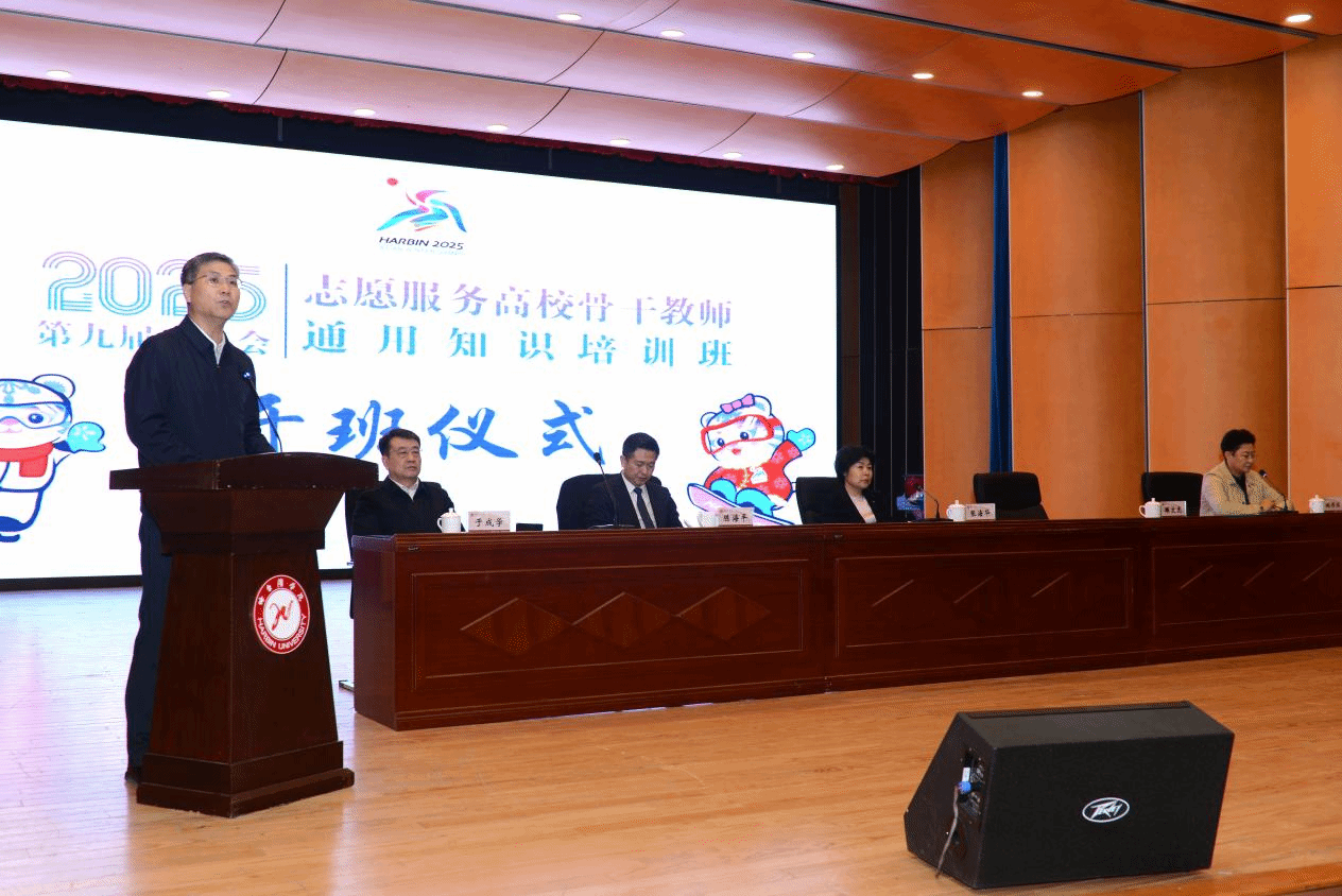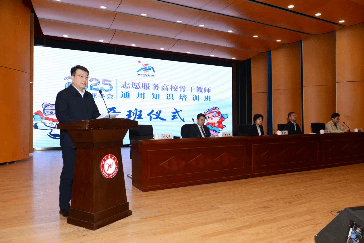 (文/张玉娟)3月29日,2025年第九届亚冬会骨干教师通用知识培训班开班仪式在我校成功举办。亚冬会执委会副主任、市政府副市长张海华作开班动员讲话。省教育厅党组成员、副厅长雒文虎、团省委副书记陈海平、我校校长、党委副书记于成学、副校长吴旭峰出席本次活动,会议由亚冬会执委会副秘书长姚伟丽主持。来自部属、省属、市属高校的优秀骨干教师以及市直单位志愿者约160人共同参与了这一重要时刻。