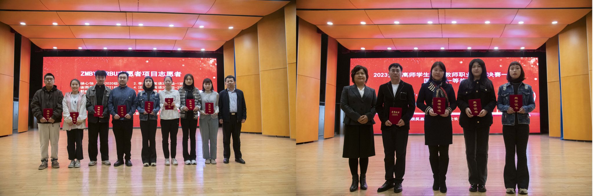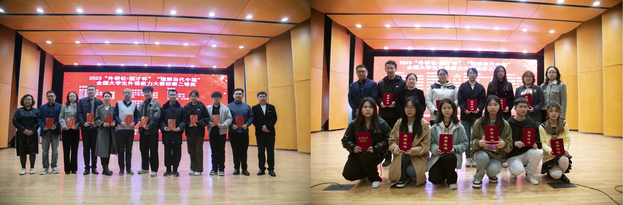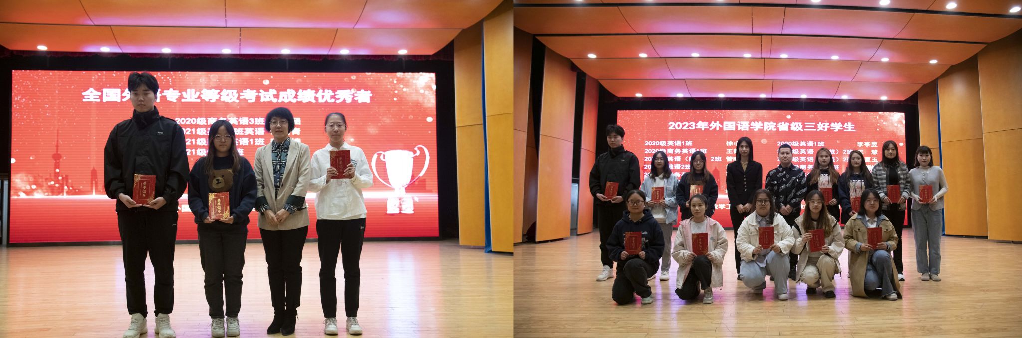 与会校领导及嘉宾分别为省级三好学生、国家奖学金获得者、全国高师学生英语教师职业技能大赛、“外研社·国才杯”“理解当代中国”全国大学生外语能力大赛等10项学科竞赛获奖者、全国外语专业等级考试成绩优秀者、研学专班优秀团队、中美笔友志愿者项目参与师生、“外语之声”学术讲座教师等集体和个人颁奖。