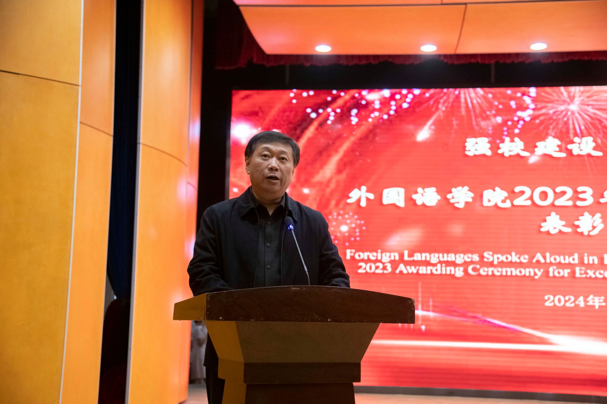 于少鹏在致辞中代表学校向取得优异成绩、受到表彰的集体和个人表示祝贺,向辛勤付出的老师表示由衷的敬意。他指出,外国语学院始终坚持把习近平新时代中国特色社会主义思想融入育人全过程,把立德树人作为根本任务,秉持学校“三三五”发展战略和“一高·两有·三强”应用型人才培养定位,以学生为中心,以质量为根本,不断创新人才培养模式,努力提升教育教学水平,取得了显著的成绩,为我校人才培养质量的提升注入了强劲的动力。他希望,外国语学院能够继续发扬优良传统,再接再厉,锚定更高目标,五育融通、产教融合、科教融汇,为培养更多优秀外语人才。希望莘莘学子们不负韶华,刻苦奋进,不断追求卓越,为实现个人理想和中华民族伟大复兴贡献自己的青春和力量。