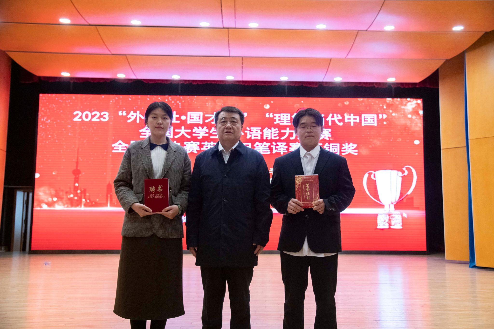 会上,于成学为“外研社·国才杯”“理解当代中国”全国大学生外语能力大赛全国决赛铜奖获得者、英语专业学生李亮及指导教师徐默颁奖。