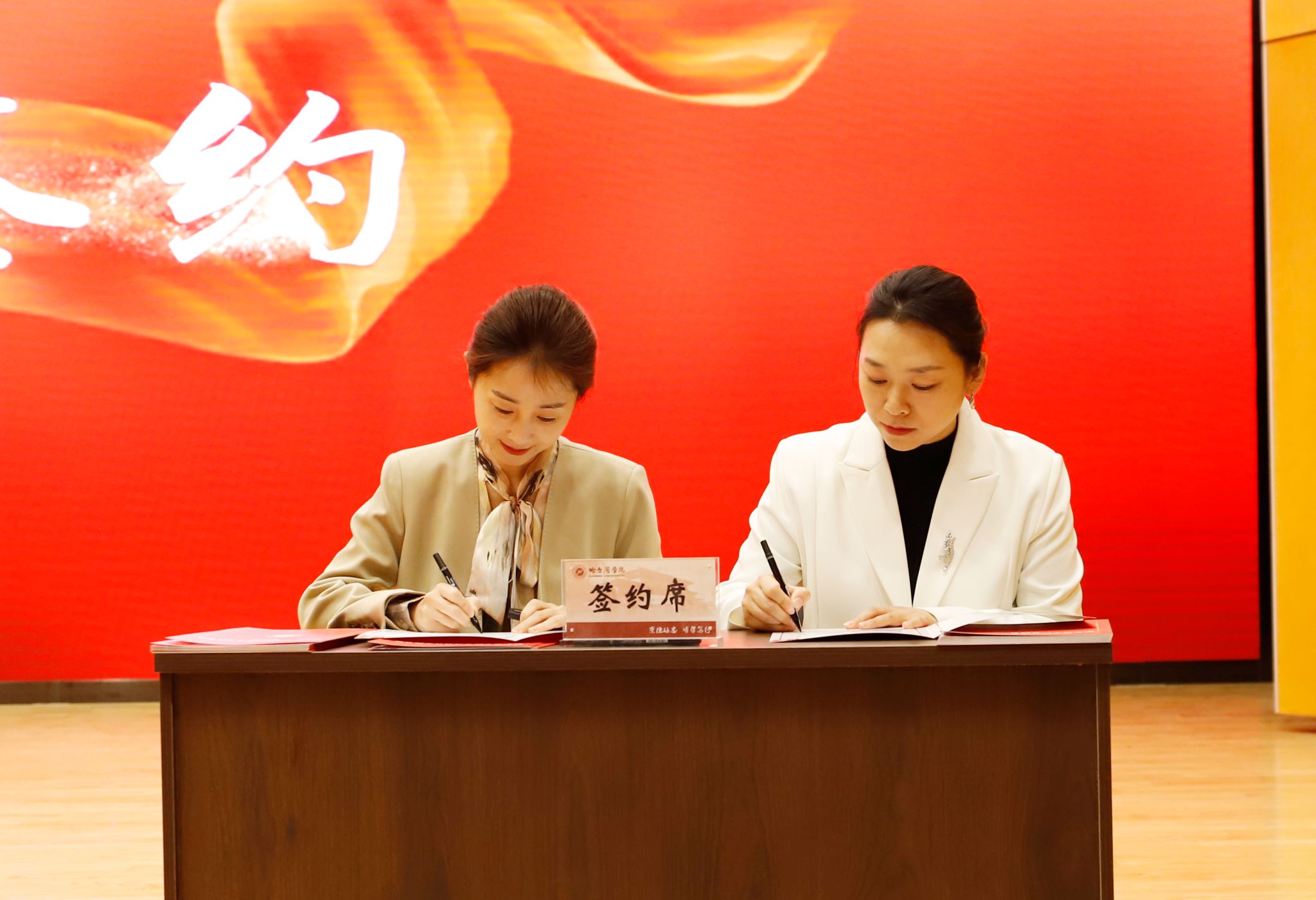 仪式中,李娜为12家单位负责人颁授“哈尔滨学院劳动教育实践育人基地”牌匾,学生处处长于迪与相关单位代表签订《哈尔滨学院劳动教育实践基地签约书》。
