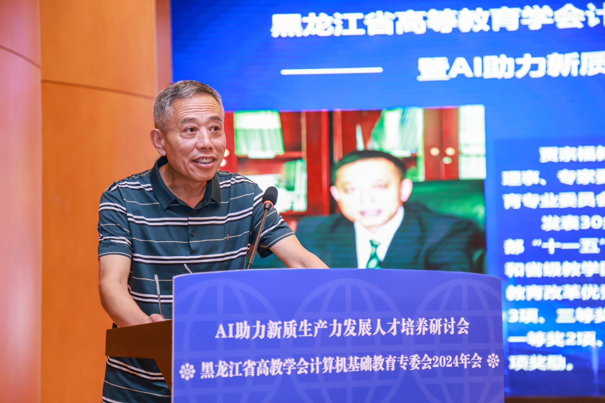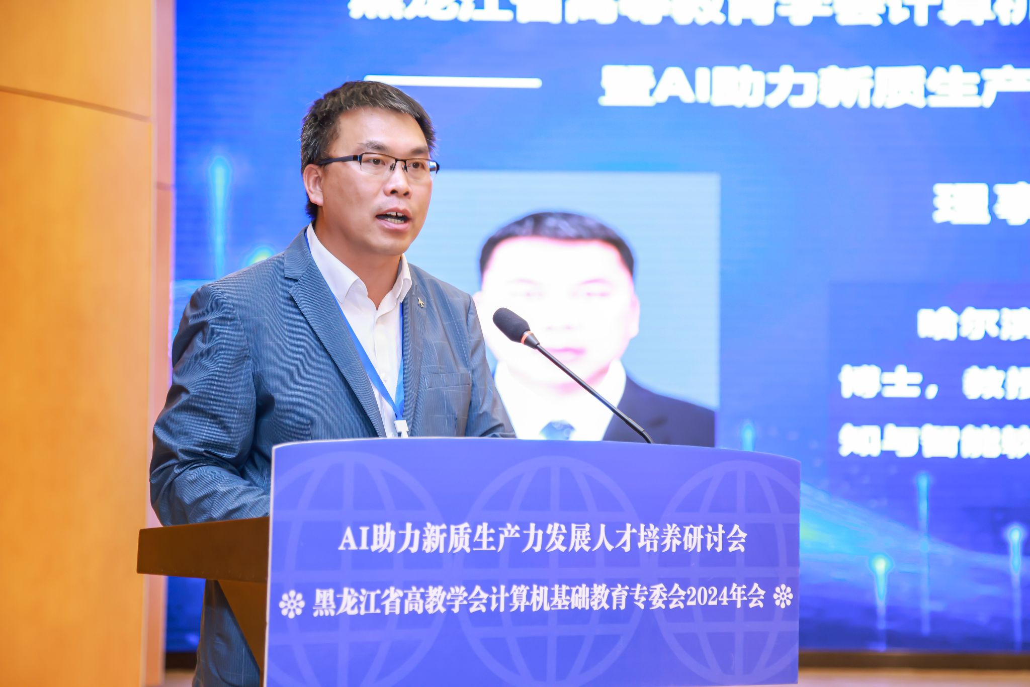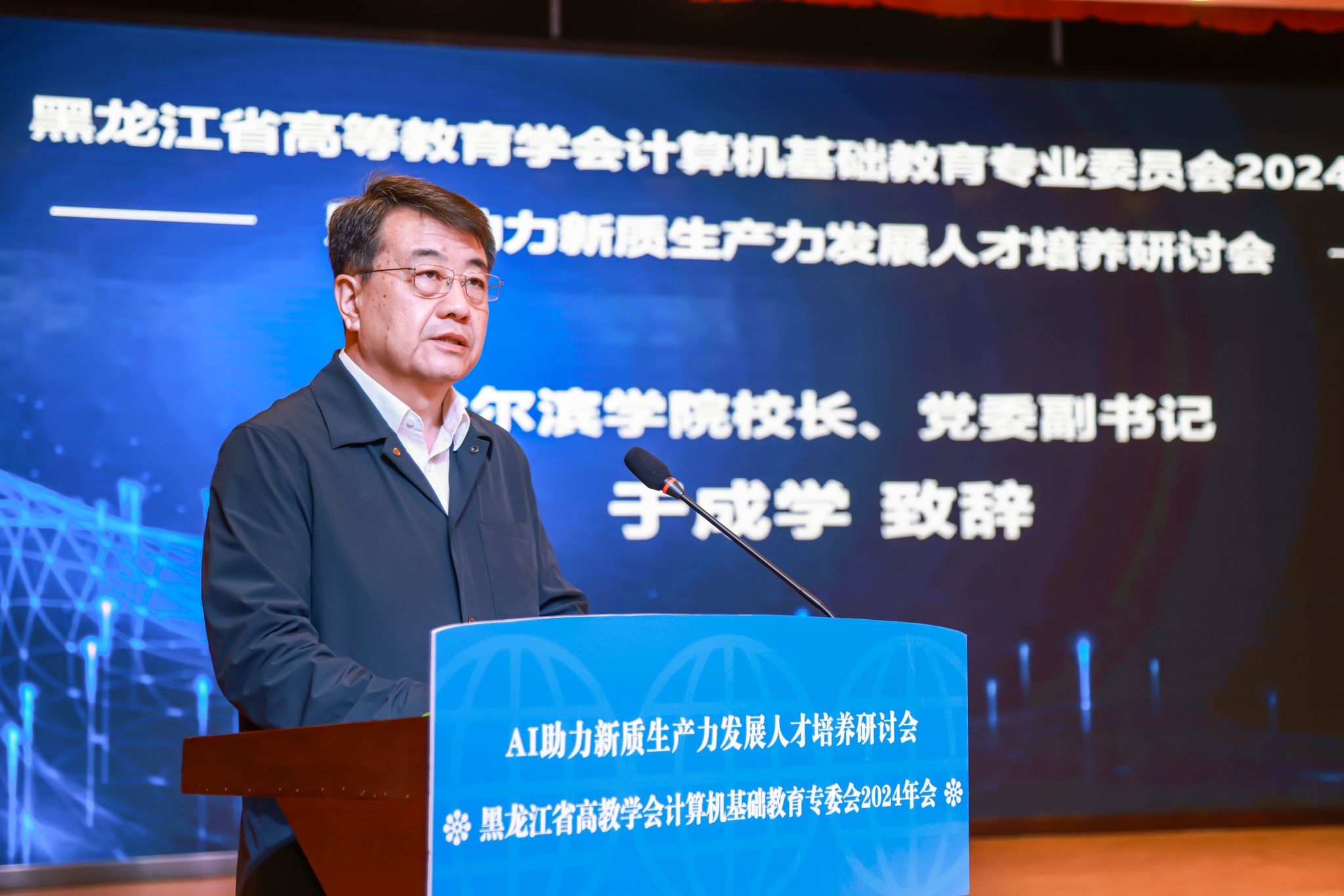 于成学在开幕词中首先对远道而来的嘉宾表示热烈欢迎,并强调了在当前人工智能技术飞速发展的背景下,探讨AI助力教育转型与人才培养的重要性。他指出,哈尔滨学院始终致力于大学计算机基础教育的创新与实践,期待与各位同仁携手共进,共同探索人工智能教育的新路径。