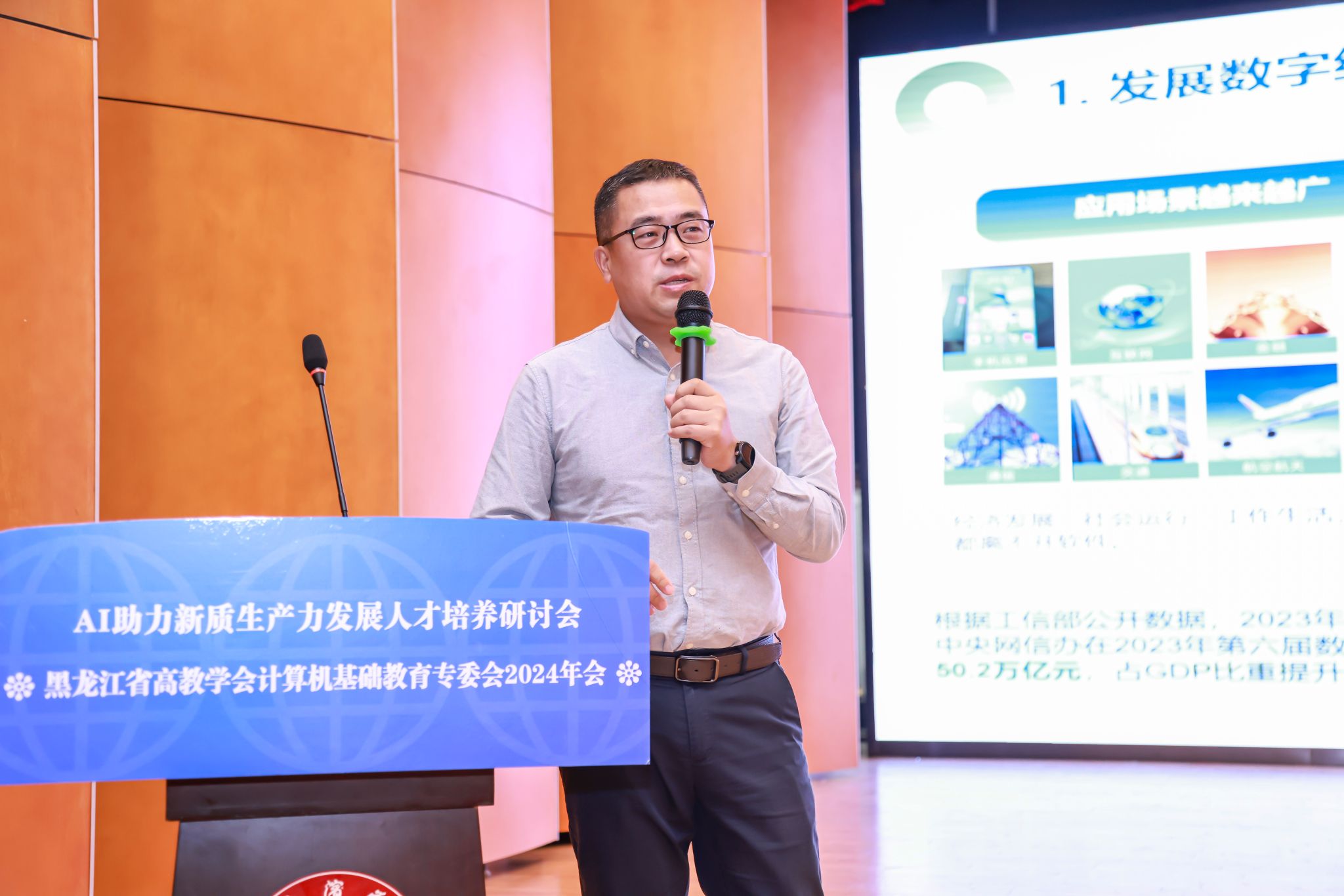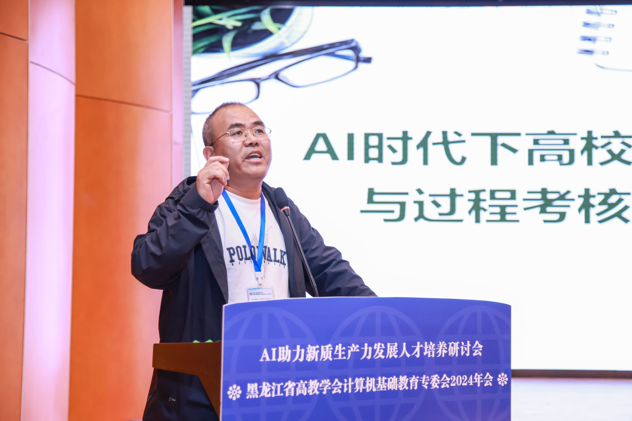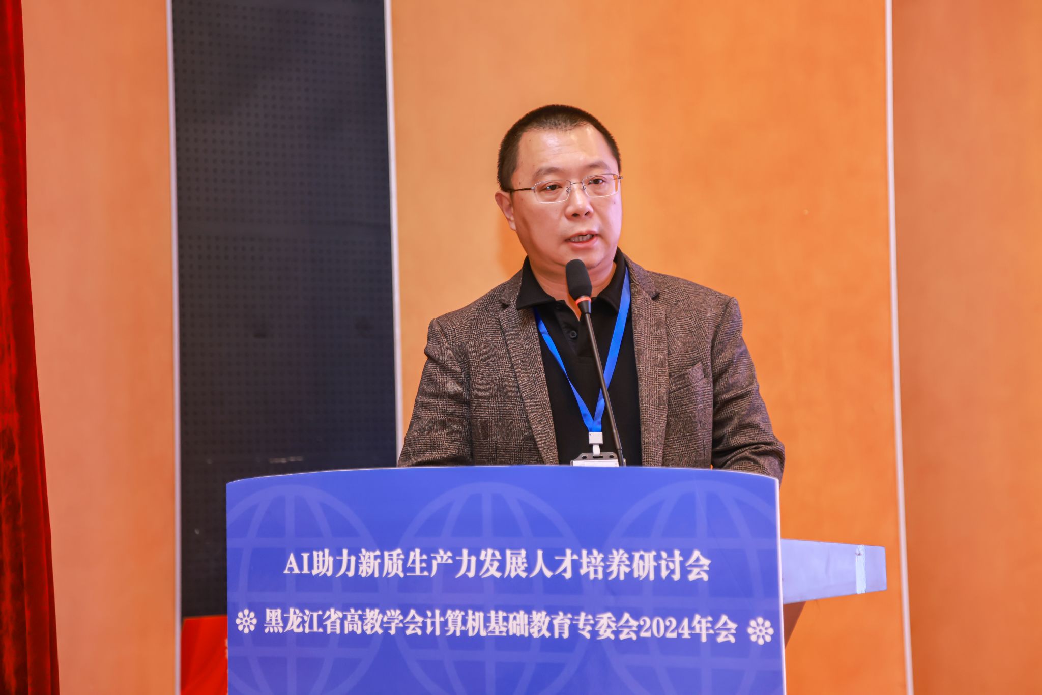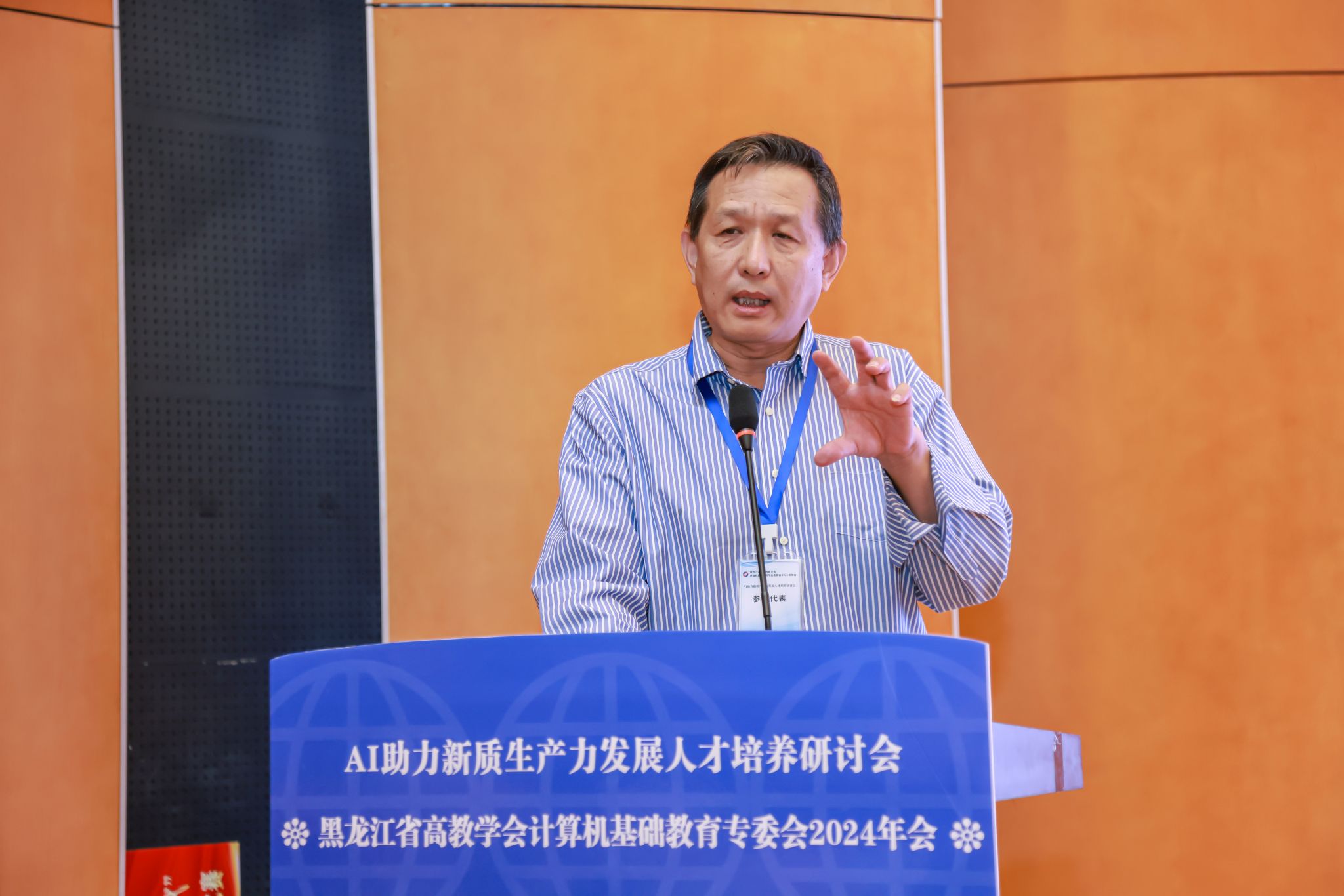 于成学在开幕词中首先对远道而来的嘉宾表示热烈欢迎,并强调了在当前人工智能技术飞速发展的背景下,探讨AI助力教育转型与人才培养的重要性。他指出,哈尔滨学院始终致力于大学计算机基础教育的创新与实践,期待与各位同仁携手共进,共同探索人工智能教育的新路径。