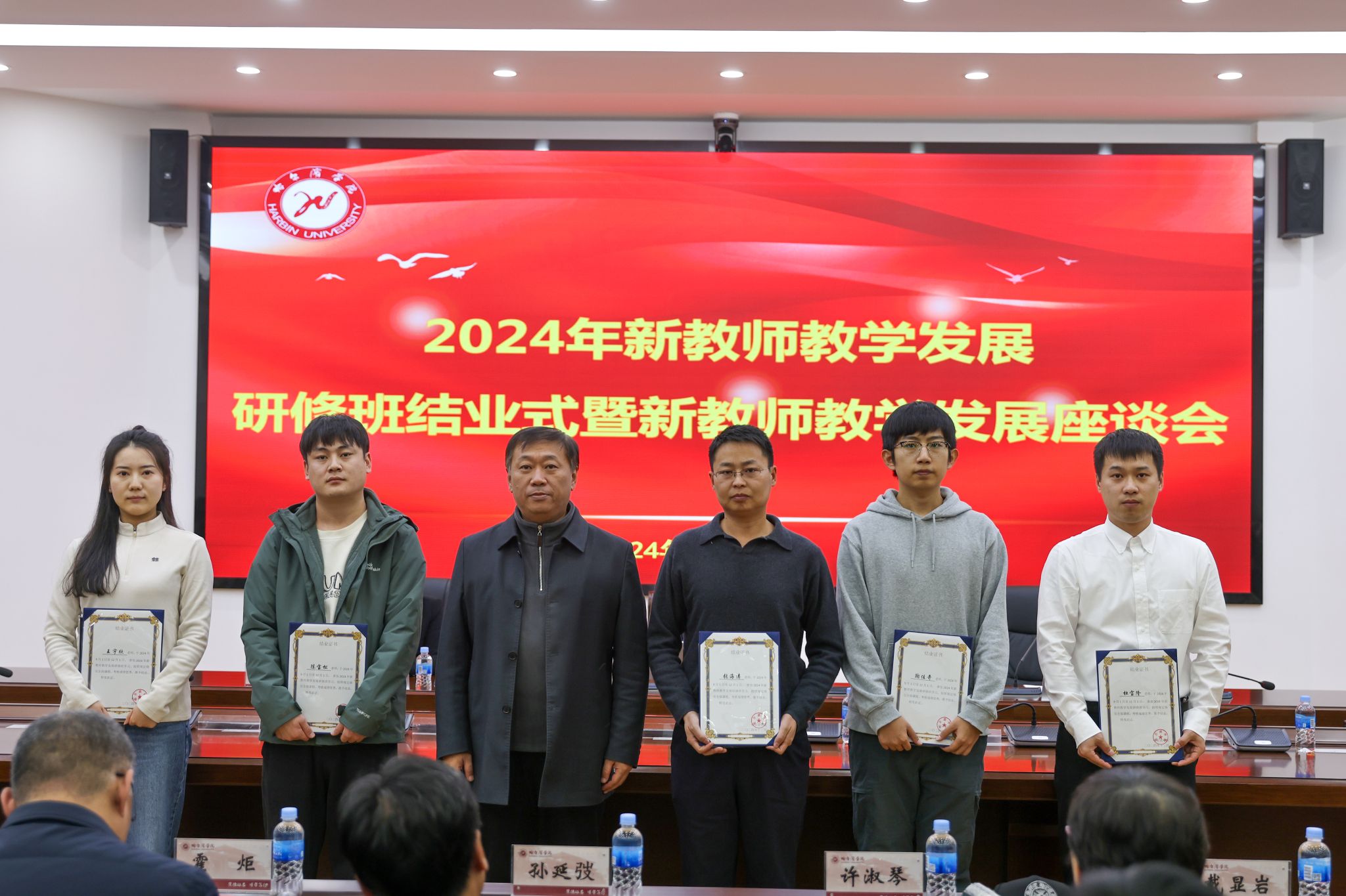 宋阔对2024年新教师教学发展研修班培训情况进行总结汇报。本期研修班培训内容丰富,学习方式多样,共举办了4场“哈苑教学学术报告”、 5次“哈苑教学发展沙龙”、1次“哈苑教学名师谈成长系列讲座” 、 2期“哈苑教学促进工作坊”、4场“教师数智化能力提升系列培训”、1期“哈苑公开课”、6场哈苑校情系列培训会、1场新教师见面会、 1场心理团体训练拓展活动和 5场参观活动。研修内容涵校史校情、教师素养、师德师风、教学理念、教学方法、教学学术与研究、教师综合素质发展等模块,研修方式上体现“校本研修与校外培训相结合、在线自主学习与线下集中培训相结合、理论研修与实践演练相结合”原则,青年教师助讲培养工作同期实施。根据研修对象的教育教学实践情况,学校秉承“分类指导 分类培训”原则,弹性灵活地规定本期研修班培训学时要求。研修期间,学员们共完成了总计144学时的线上、线下课程学习任务,并提交了研修总结、线上学时认定材料、研修成果展示视频等考核材料,全体学员达到考核要求,均准予结业。针对28位无教学经历或从事教学工作不足三年的教师学员提交的微课视频及教学设计材料,教师教学发展中心邀请校内专家进行评审,按照文科组、理工科组、艺体外组分组方式,评选出3位老师获“新教师微课教学优秀奖”。结合研修方案关于学时要求、考核请假相关规定以及每次活动签到和上交材料统计,综合出勤表现,评选出5位老师获“新教师研修出勤优秀奖”。
