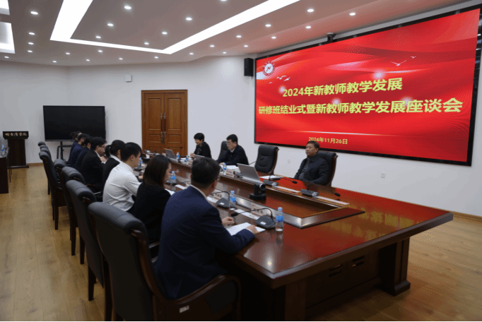 (文/宋阔、周晶)11月26日,在党政办公楼404会议室举办了2024年新教师教学发展研修班结业式暨新教师教学发展座谈会。校长于成学出席会议并讲话,副校长于少鹏、各二级学院领导、指导教师代表及研修班全体学员参加会议。会议由教师教学发展中心主任宋阔主持。