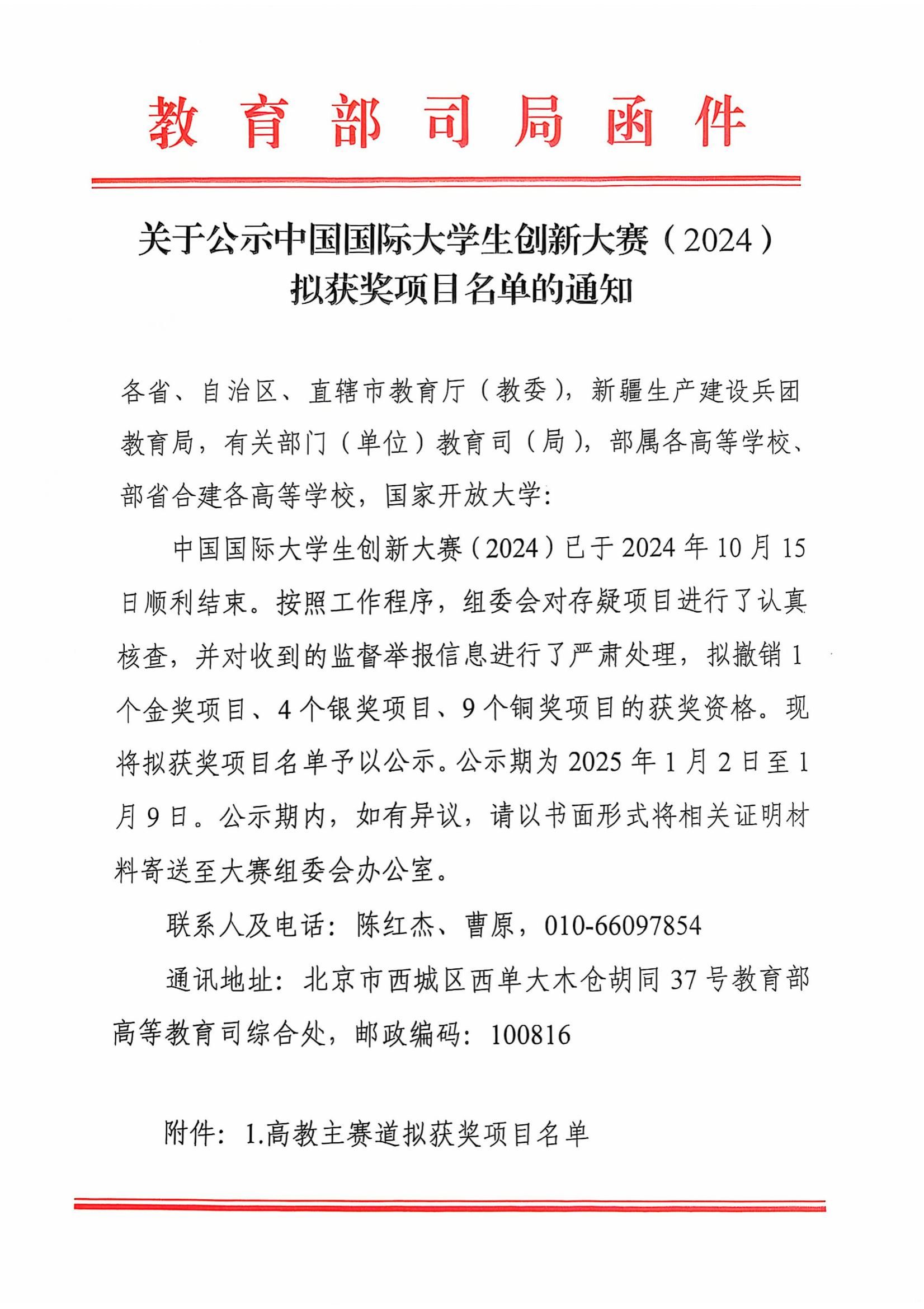(文/王忠元)近日,教育部发布了《关于公示中国国际大学生创新大赛(2024)拟获奖项目名单的通知》,我校在中国国际大学生创新大赛(2024)中获得5项国家级奖项,获奖数量(高教主赛道+红旅赛道)上升至全省高校第六名,位次取得新的突破。其中地理旅游学院2021级旅游管理张晓钰同学《饲牛康——开启牛瘤胃胀气防治和增重新时代》、食品工程学院2021级化学(师范)张琳同学《醇和腈明—开启绿色低碳化工新纪元》、2022级化学(师范)高弘同学《锰揽乾坤—混合型锰基柔性电极材料领航者》、2022级食品科学与工程专业李勤龙同学《触“墨”未来——绿色高效废纸脱墨融合型生物菌剂》荣获高教主赛道国家级铜奖,2022级食品质量与安全唐喆同学《菌肥先锋---新型复合高效环保AMF菌有机粪肥》获得青年红色筑梦之旅赛道国家级铜奖。